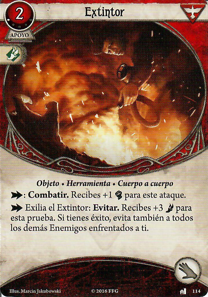 Si tu grupo tiene muchos jugadores, quizás incluso consideraría el Instinto de Supervivencia mejorado y… ojo al dato… el Extintor. Ambas por el simple hecho de que si en algún momento hay muchos enemigos en un mismo sitio y por algún casual tienes el evento especial de Rita, puedes convertir estas cartas en mini explosiones de dinamita que además evitan enemigos.