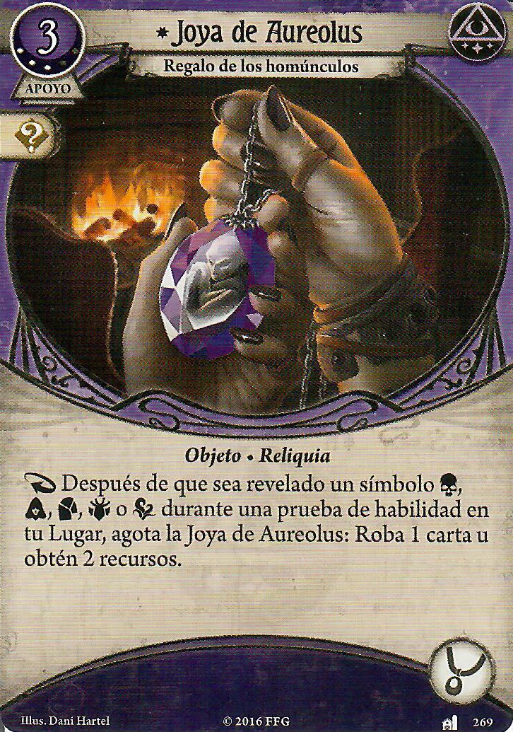 La estatua grotesca es una carta muy popular con un efecto siempre útil, por lo que dejarle libre un espacio de mano no suele ser un sacrificio. Por otra parte, la Joya de Aureolus y el Símbolo Arcano Cristalino apenas se ven en otros sitios, y con razón. Ambas cartas ocupan un hueco de accesorio, de los que en un principio solo tenemos uno. No solo eso, sino que los místicos tienen ya otros accesorios muy populares: el Rosario Sagrado y la Llave de San Huberto. Ambas son cartas de nivel 0 que potencian el punto fuerte de los místicos, la Voluntad, lo que les ayuda mucho a asegurar el éxito usando hechizos y a resistir las cartas de traición que vayan saliendo.