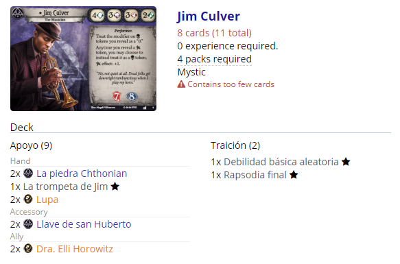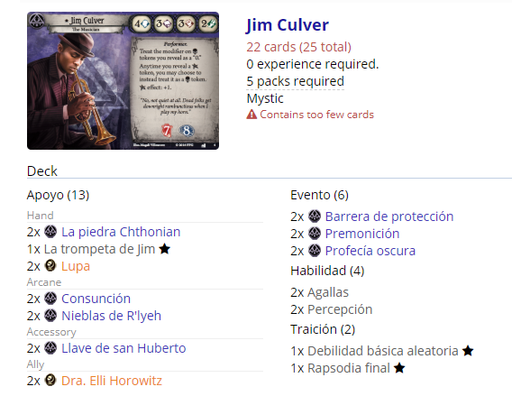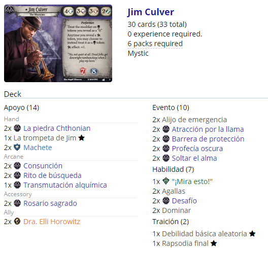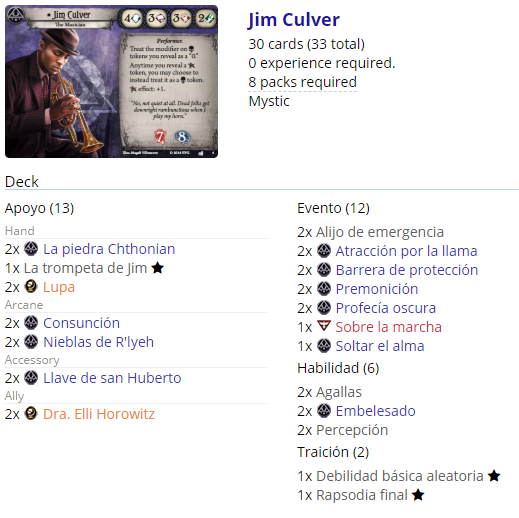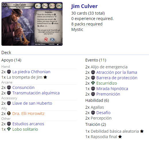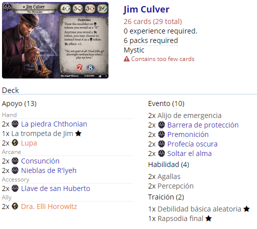 ¡Excelente análisis, muchas gracias! Me ha servido para hacer mi primer mazo de Místico, que ha sobrevivido a Dunwich. Algunos comentarios después de ver cómo ha ido la campaña: la Dra. Elli, pese a ser muy buena, muchas veces no lograba tener reliquia, pues no había tantas en el mazo; habría preferido cambiar una de ellas por una Iniciada en lo arcano inicialmente; y en el tema recursos, Jim acostumbraba a ganar muchos recursos y no podía gastárselos, pues todo en el mazo era barato, aunque no me gusta demasiado, unos Estudios Arcanos habrían venido bien. Muchas gracias de nuevo, ha sido muy divertido llevar a Jim.