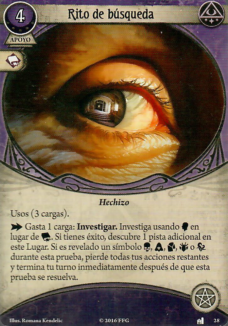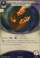 ¿Cómo consigue pistas este mazo? La forma más típica y rápida de conseguir pistas para un místico suele ser el Rito de Búsqueda… que no vamos a usar. Si bien es la mejor manera de usar el atributo más fuerte de Jim para conseguir pistas, es un apoyo muy caro que no tiene cabida en un mazo que ya requiere de muchos apoyos y recursos para funcionar como es el nuestro. En su lugar, vamos a intentar potenciar la mediocre capacidad de investigación de Jim y aprovecharnos de su habilidad de investigador para conseguir pistas de manera segura. Para ello los místicos cuentan con un accesorio cojonudo: la Llave de san Huberto. Aunque cueste sus buenos cuatro recursos, el bonus a Voluntad y a Intelecto se van a hacer notar siempre que salga a la mesa.