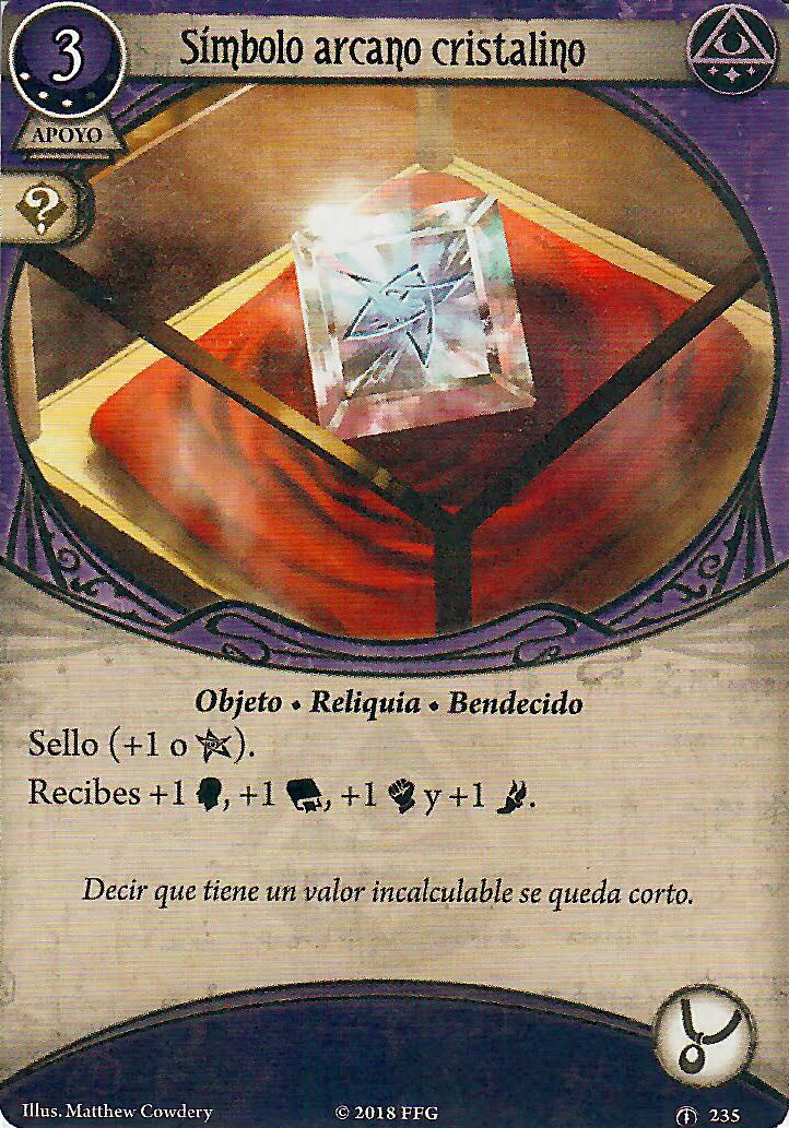 4) Cambiar la Llave de San Huberto por el Símbolo Arcano Cristalino (o el Mapa de hemisferios si estás jugando en Multijugador): es una opción más barata en recursos pero que nos quita de la bolsa del caos una ficha que casi nos asegura el éxito. De media, en Jim aumenta mucho las probabilidades de que tengamos éxito, pero siempre jode un poco saber que la bolsa es un poco peor. La parte buena es que pueden haber dos en mesa al mismo tiempo. Además, es una Reliquia.