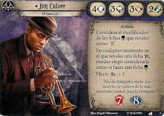 Lo veis, verdad? Su habilidad de investigador convierte el modificador de las fichas de calavera en un 0. Esto significa que, por lo general, Jim va a tener en la bolsa entre dos y tres fichas más con un modificador de 0. Esto se traduce en: “Jim se la puede jugar más que el resto de investigadores porque la bolsa del caos es un poquito más amable con él”.