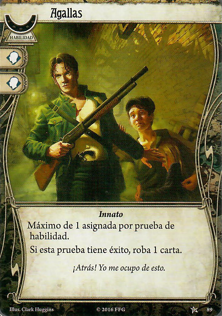 En este mazo no es difícil que no aparezca alguno de sus componentes importantes, lo cual nos ralentizará considerablemente a la hora de avanzar, así que vamos a meter también las cartas de habilidad neutrales de los stats que vamos a usar si o si, no solo para robar cartas, sino para ayudarnos cuando nos venga una prueba especialmente difícil o importante. Agallas y Percepción pa’l saco, pues.