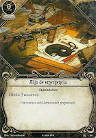 Como podréis ver, tenemos apoyos a saco y ya comenzamos a escasear en espacio para cartas en nuestro mazo. Así de primeras, yo metería las dos cartas de generación de recursos más accesibles para este investigador, el Alijo de Emergencia y Soltar el Alma.