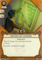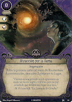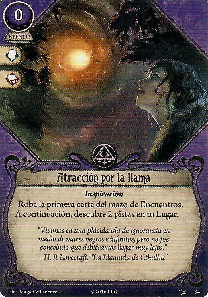 En estos momentos, el mazo es capaz de llegar a 5 de intelecto a la hora de investigar. Este es un valor muy alto, especialmente para Jim, por lo que, aunque en un principio no vería necesario mejorar más la parte de investigación, me da un poco de miedo perder la carrera contra el escenario. Para intentar conseguir pistas a mayor velocidad voy a usar el último hueco de cartas de otras clases para meter un Sobre la Marcha. Otras muy buenas opciones serían Siguiendo una Corazonada, Deducción, Escena del Crimen o ¡Mira lo que he encontrado!, pero me gusta el aspecto reutilizable de Siguiendo una Corazonada, y el -1 al valor de velo de tu lugar se nota un poco más siendo Jim.También voy a incluir dos copias de Atracción por la llama para evitar hacer pruebas en sitios con un valor de velo muy alto que, además, suelen dar también puntos de victoria.