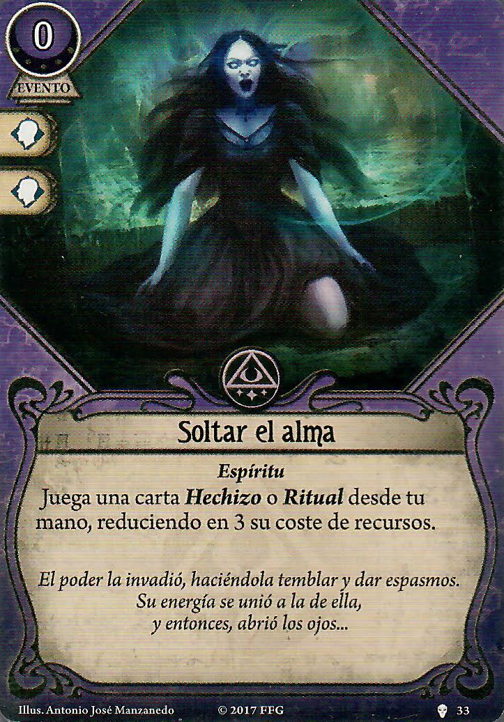 Soltar el Alma tiene una desventaja y dos ventajas frente al Alijo de Emergencia. Su contra es que solamente puede reducir el coste de cartas Hechizo y Ritual, pero a cambio es más eficiente en cuanto a acciones que el Alijo de Emergencia y puede ser asignado a una prueba de habilidad para conseguir dos símbolos de voluntad, por lo que si no nos hace falta no tiene porqué quedarse muerta de risa en la mano. Fuera de nuestra clase, tenemos herramientas de generación de recursos interesantes como Encontrar Consuelo y Lobo Solitario, pero me gustaría guardarme ese último espacio de carta de otras clases para algo más.