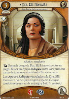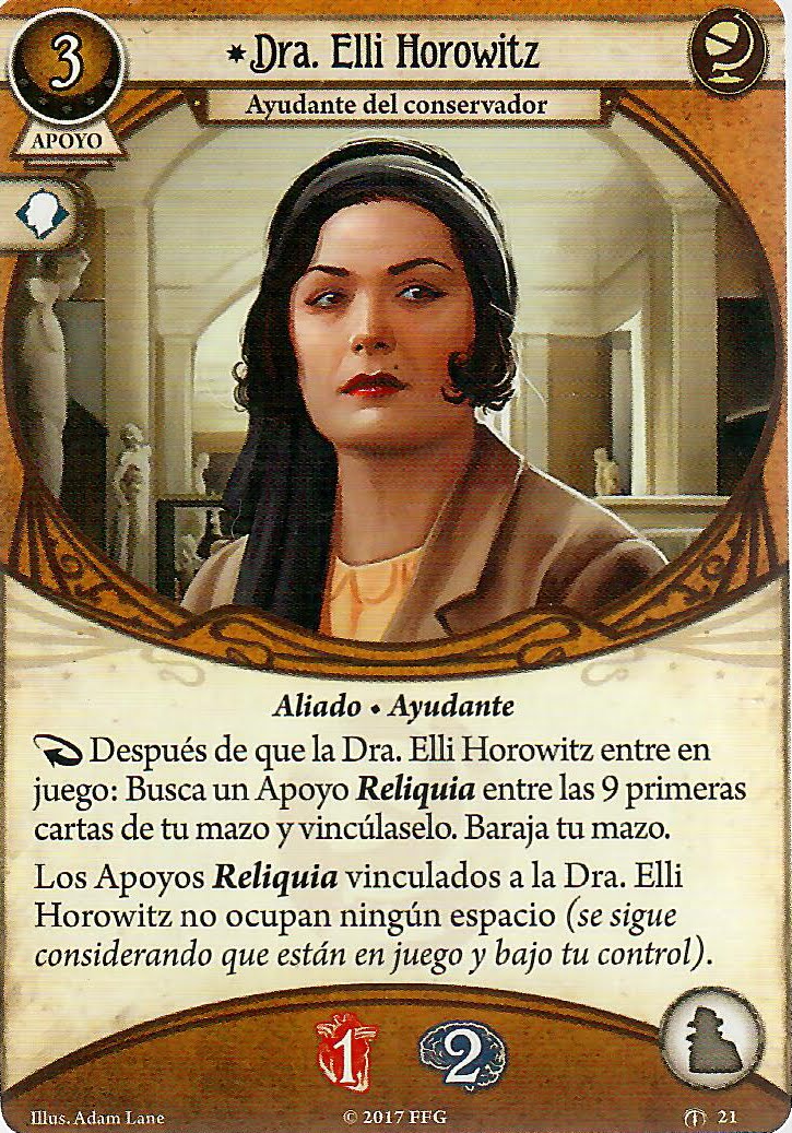 Con el ciclo de La Era Olvidada, no solo llegaron un porrón de cartas Reliquia, sino que además llegó la Dra. Elli Horowitz, un aliado nivel 0 de buscador que va a ser la base sobre la cual construiremos el mazo. La Dra. Eli nos permite, después de jugarla, buscar una carta de Reliquia entre las primeras 9 cartas del mazo y asignársela a ella. No solo, con un poco de suerte, tendremos acceso a una de las reliquias de nuestro mazo y sus habilidades sin pagar los recursos necesarios para jugarla, sino que, además, al llevarla nuestra compañera, ¡no ocupa ningún hueco de mano, ni accesorio, ni nada de nada!