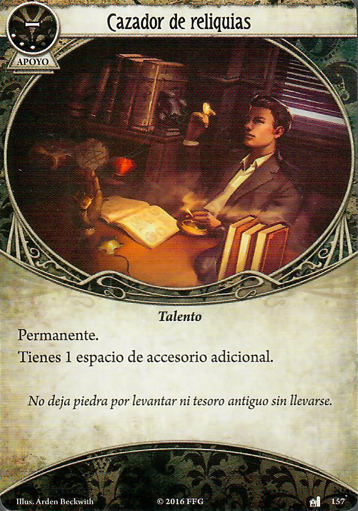 Hay muchos modos de construir este mazo: enfocándolo a investigación, combate, apoyo, centrándose en las reliquias, en el sellado de fichas… Todo esto va a depender de lo de siempre, de si va a jugarse en modo campaña, en solitario, con qué otros investigadores, etc. Pero hay un kit de cartas que en este mazo yo incluiría siempre, veamos su…
