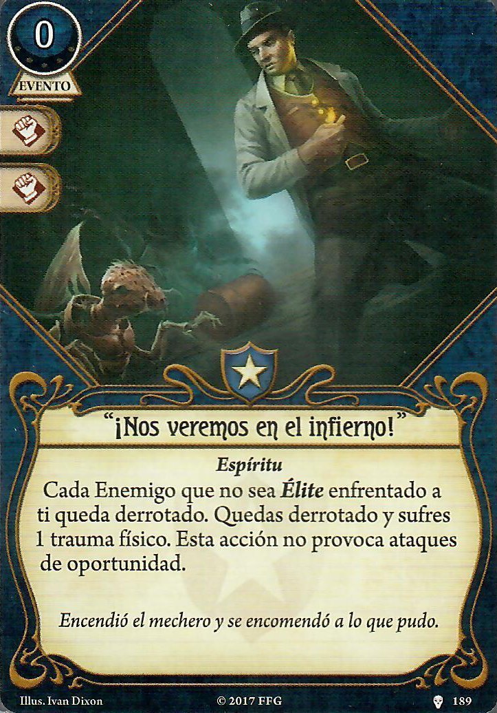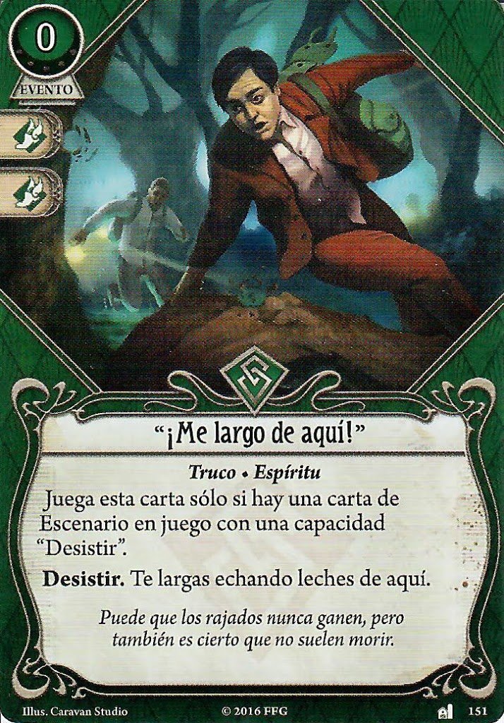Y luego están las cartas que te sacan de la partida mientras tus compañeros te miran mal. «¡Yo me largo de aquí!» es, francamente, una muy buena opción para un mazo de Calvin, especialmente si conoces la campaña que vas a jugar. Por otra parte tenemos «¡Nos veremos en el infierno!» y Revelación espantosa, ambas cartas útiles si quieres conseguir un par de traumas rápidamente para funcionar mejor al principio de la campaña, pero no voy a poder deciros cómo funcionan porque soy lo suficientemente cobarde como para no meter más modos de recibir traumas en un mazo de Calvin. De todos modos ninguna de estas cartas llega a ser inútil en ningún momento, los iconos dobles las hacen geniales para asignar a pruebas de habilidad si te ves capaz de acabar bien un escenario.