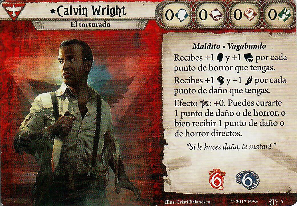 Mientras otros investigadores ven su vida y su cordura como una cuenta atrás de cuánto van a tardar en ser derrotados, Calvin los ve como otro tipo de recursos que va a tener que equilibrar a lo largo de una partida. Por supuesto, vas a querer que tu vida y cordura estén bajos para poder ser más efectivo durante una partida, pero a su vez no vas a querer ser derrotado por daño u horror inmediato que puedan llegar a venir de una carta de encuentros, de escenario, de algún lugar, etc. Es este equilibrio lo que hace que este investigador sea, para mi, tan divertido durante una partida, y esque cada partida va a ser la partida más tensa de tu vida desde el principio.