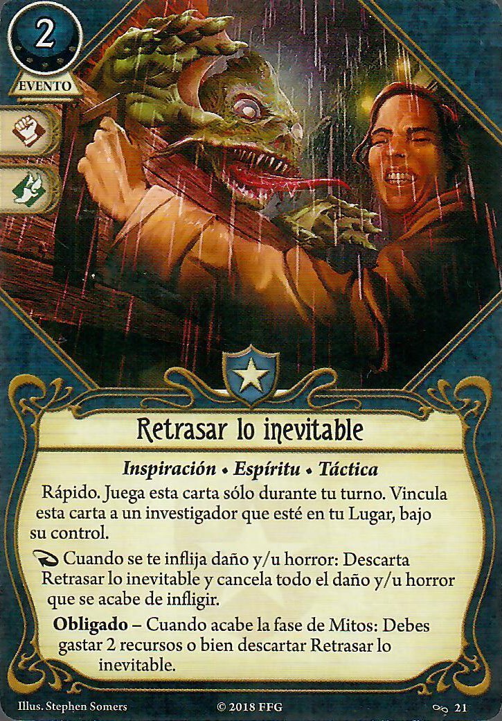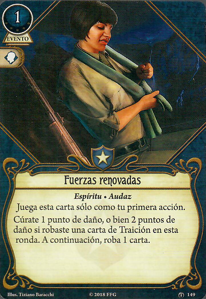 Fuerzas Renovadas funciona especialmente bien con «¡Yo me encargo de esto!», aunque no siempre va a ser la mejor opción. Recordad que si os curáis el daño u horror también estáis perdiendo stats hasta que lo recuperéis. Por esa razón, me gusta cambiar esta carta por «Me las he visto en peores… » de nivel 2, capaz de prevenir tanto daño como horror a cambio de ninguna acción y encima te puede dar hasta dos recursos, muy rico todo.