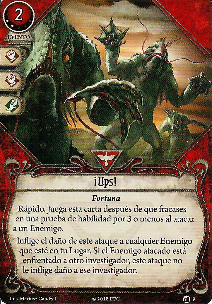 Pero a ver, los supervivientes no se dedican únicamente a sobrevivir, y hay que aprovechar las ventajas de esta clase. Una de las ventajas de ser un fracasado es que te acostumbras a cagarla en todo lo que emprendes, y comienzas a verle el lado bueno a las desgracias. ¿No consigues una pista? «¡Mira lo que he encontrado!», ¿Las has cagado al atacar? «¡Ups!». De esta última carta recomendaría encarecidamente que le echaseis un buen vistazo a la versión mejorada. En una build muy específica que os contaré en otro artículo puede brillar. Pero volviendo al tema del fracaso, no olvidéis Encontrar Consuelo, posiblemente el motor de robo doble más potente tanto a nivel temático como mecánico.