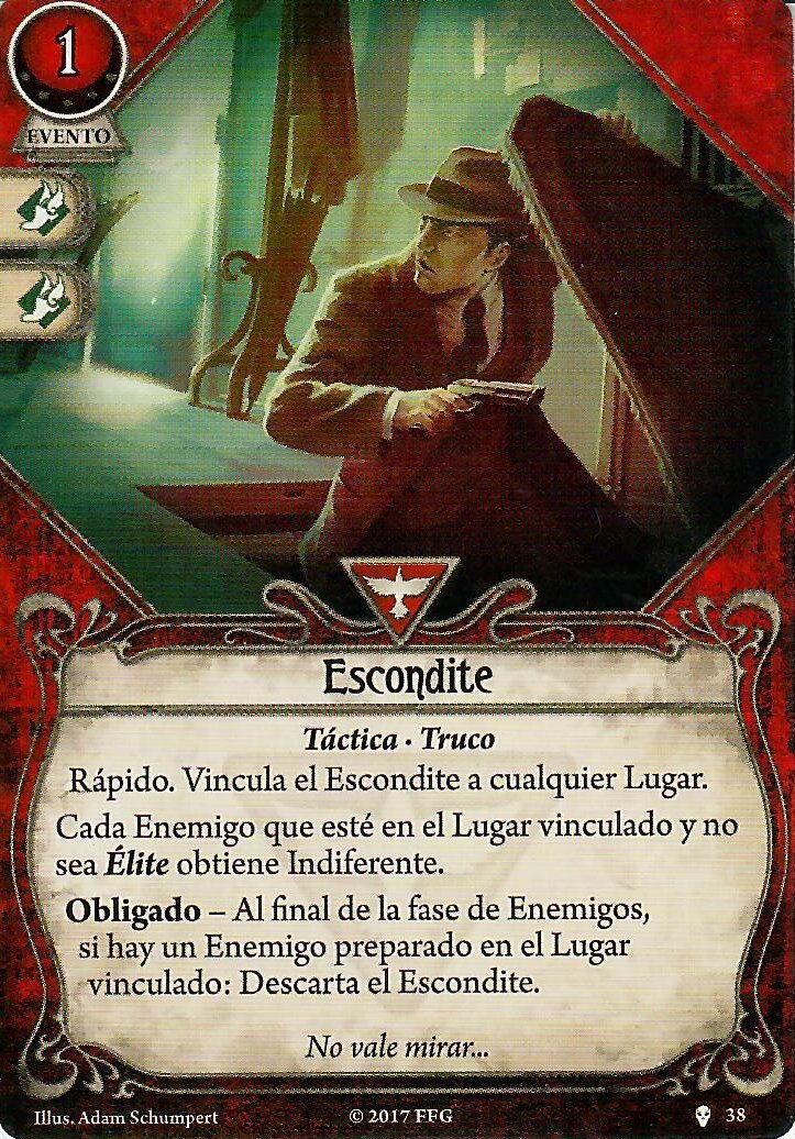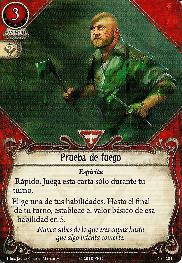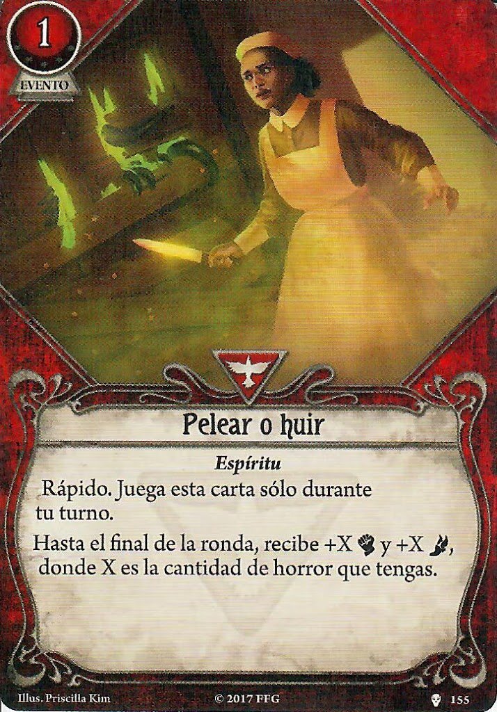 Siendo Calvin es muy normal ver que al principio de la partida, especialmente en los primeros escenarios de una campaña, no conseguís sacar nada a derechas, por lo que vais a fallar la mayoría de las pruebas de habilidad. Y si bien las cartas anteriores van a ayudaros a avanzar y mantener vuestro tempo, tenéis que incluir en vuestro mazo cartas que os ayuden a ser mejores de manera activa, aunque solo sea temporalmente. Actualmente tenemos dos opciones para que investigadores como Calvin o Preston (y tiene pinta que también podrían ser útiles para Patrice) se conviertan temporalmente en los putos amos en algo. Os hablo de Pelear o Huir y Prueba de fuego. Estas dos cartas brillan especialmente en mazos de Calvin porque el bufo se suma al que recibe por su carta de investigador. Y aunque Calvin no tenga las montañas de recursos de Preston para usar cartas como Prueba de Fuego, puede conseguir estos recursos, porque también es el candidato ideal para Apurando, el motor de robo más abusable del juego. Esque puede ser tan potente que deja de ser gracioso, de verdad. Dependiendo de vuestro mazo, recomendaría llevar solo una de las dos opciones. Pelar o Huir encaja mejor en mazos normalitos de Calvin, especialmente en los que intentan activar Hermético.