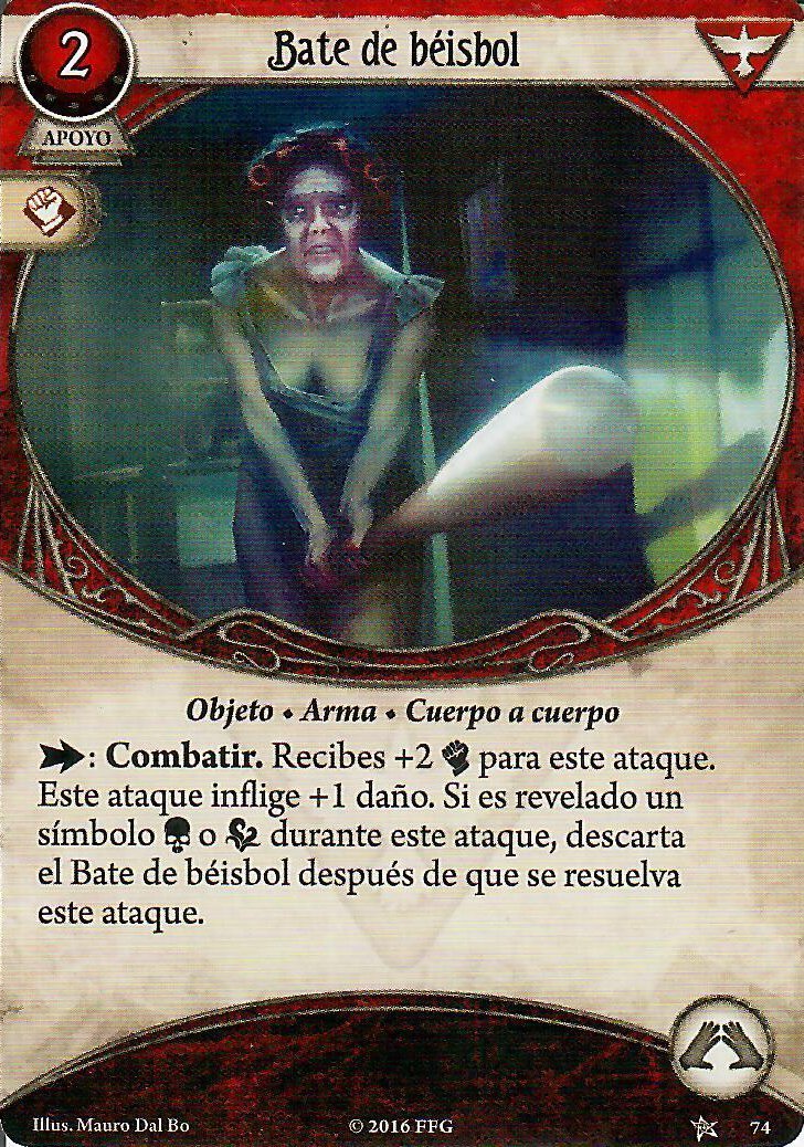 Vale, ya se que ésta no es una carta muy popular, pero el Bate de béisbol es una muy buena opción para conseguir un buen bufo de combate y un +1 de daño seguro… hasta que deja de serlo. Por supuesto tiene el riesgo de romperse, y eso jode, pero puedes aprovechar cartas como Habilidoso para recuperarlo de la pila de descartes. Vivir y aprender es una muy buena opción para Calvin en general, pero aquí lo es especialmente para cuando saques un fallo automático de la bolsa al atacar con el bate. Por mucho que vaya a descartarse, vas a poder repetir la prueba de combate tal como se describe en la carta antes de despedirte de tu arma. Jugando de este modo, es recomendable incluir en el mazo o bien un par de Rescate heroico o un par de Mano a Mano, para poder hacer un punto de daño automático a los enemigos de 3 puntos de vida y minimizar el número de ataques necesarios para derrotarlos con un bate.