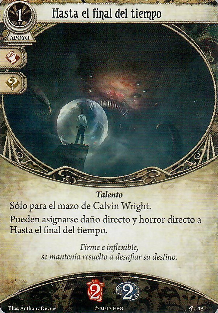 Hay bastantes opciones interesantes fuera de su clase, mayormente de guardián, pero hay algo que tienen muchas en común, y es que pueden hacer que Calvin desempeñe un rol de support más que decente. «Yo me encargo de esto!» va a darle un respiro a un compañero, y podrías llegar a recibir algo de daño u horror por hacerle un favor a alguien, que para ti es algo fantástico. La Barrera de Protección te va a hacer un horror y cancelar una carta de traición, ¿qué más podrías pedir? Ah claro, la versión mejorada para poder cancelar la de un compañero. Otra opción mucho más situacional (y extrema) sería Retrasar lo inevitable, que no recomendaría fuera de un mazo que usara Apurando, pero puede estar muy bien si conoces el escenario de antemano.