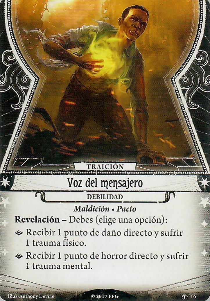 No me podréis decir que su debilidad no pega maravillosamente bien con el personaje. Osea, recibir un punto de daño u horror directo… Y UN TRAUMA FÍSICO O MENTAL. Esta debilidad es extremadamente benigna al principio de la campaña, pero si no vais con cuidado o no os acompaña la suerte, es posible que hacia el final de la campaña sea la única carta del juego que temáis de verdad. Los traumas son bastante raros de ver jugando en dificultad normal (excepto en ya sabéis qué campaña). No es tan corriente ser derrotado en esta dificultad, por lo que por lo general los recibes como resultado de decisiones muy específicas o por fallar alguna prueba de alguna carta de plan o acto. Pero si eres Calvin… oooh amigo, vas a verlos partida a partida, y la mejor parte es que no es algo malo. Pensad que tener traumas significa comenzar la partida con un personaje más fuerte y tardar menos en estar a un nivel en el que os sintáis cómodos haciendo pruebas y siendo útil en la partida.