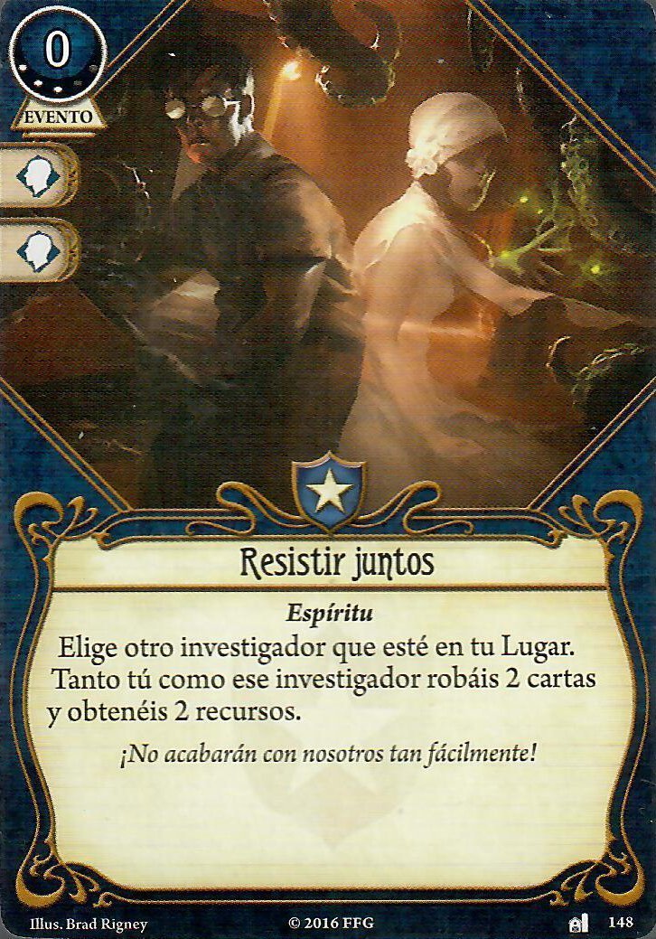 Esta última carta, recomendaría sustituirla, si vais en grupo, por Resistir juntos cuando consigáis algo de experiencia, un total de 4 cartas y 4 recursos a cambio de una acción es UNA PA-SA-DA.