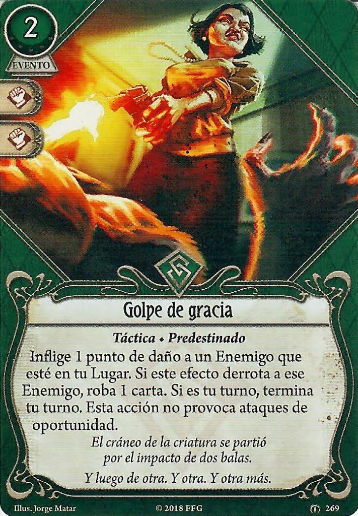 Absolutamente todas estas cartas serían buenas sustitutas mientras esperamos a conseguir experiencia. La Espada Encantada es perfecta para usar mientras esperamos a la Mauser. Proporciona un +2 de Combate y tiene el bonus de que no es obligatorio usar «munición» para atacar. Golpe de Gracia es un buen sustituto del Golpe Bajo hasta que consigamos a Chuck Fergus. La diferencia en que nos sirve para dar el último toque, en lugar del primero. Como beneficio añadido, ayuda a robar cartas y tiene unos iconos muy buenos que guardar bajo el Cristalizador de Sueños.