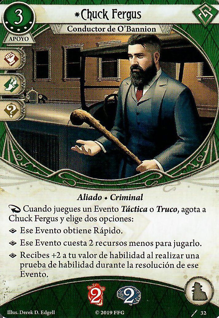 Si, el mazo ahora va a ser mucho más lento y caro de jugar. Va a tocarle planear los turnos con más cabeza y necesitaría apoyarse en sus compañeros hasta tener unos cuantos apoyos en juego Y recursos para jugar eventos. Para mi, la absoluta prioridad de mejora sería Chuck Fergus. Sé que es mucha experiencia y que quizás tras el primer escenario no de para conseguir ni una copia. Pero es que… es el alma del mazo, sin él se cae un poco.