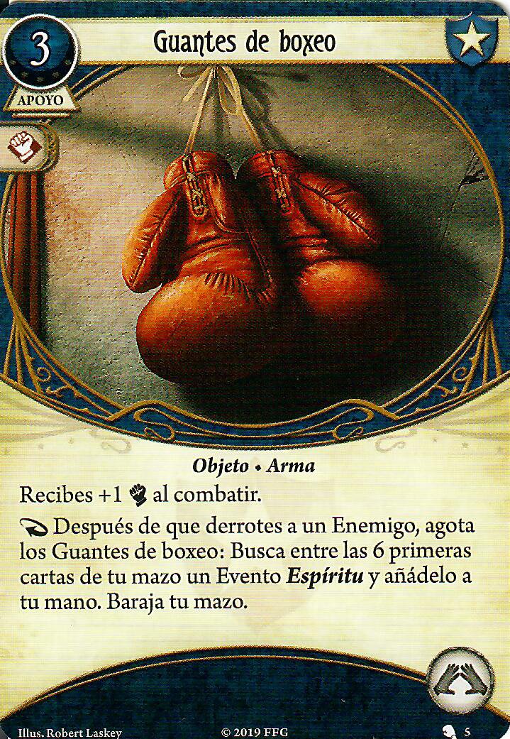 Y ahora vamos a por la sorpresita. Como podréis comprobar, muchos de estos eventos Táctica tienen también otro rasgo: Espíritu. Como nuestro motor de robo ahora mismo es limitado, vamos a mejorarlo de una manera muy peculiar. Lo primero es añadir dos copias de Gloria para poder robar cartas al derrotar enemigos. Lo segundo… Vamos a ponerle a Malasombra unos Guantes de Boxeo muy guays. Casi todos los eventos provocan acciones de combate. Este apoyo no solamente ayudará con estas pruebas, sino que también mejorará considerablemente nuestro motor de robo, teniendo en cuenta la cantidad de cartas Espíritu que habrá en nuestro mazo.