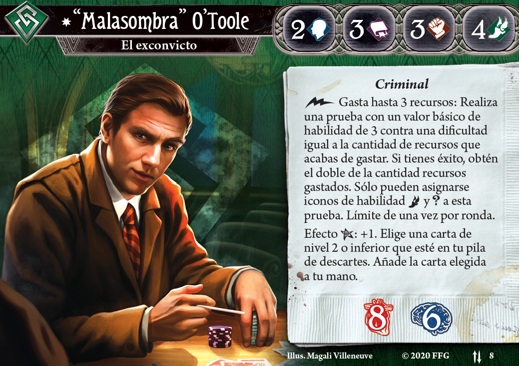 Puede parecer raro elegir la carta que mejora agilidad en lugar de combate en un mazo de pegar tortas, pero os explico mi razonamiento. Primero, el stat base más alto de Malasombra es la agilidad, así que cuando no tenemos nada equipado es más fácil conseguir robar dos cartas con ella. Segundo, nos ayudará a superar las pruebas de Puñalada por la Espalda y Hurtar, que son eventos de alto coste en los que no queremos fallar. Por último, son muy buenos iconos que asignar a la prueba de recursos del Malasombra paralelo para conseguir cartas y recursos sin usar ninguna acción.