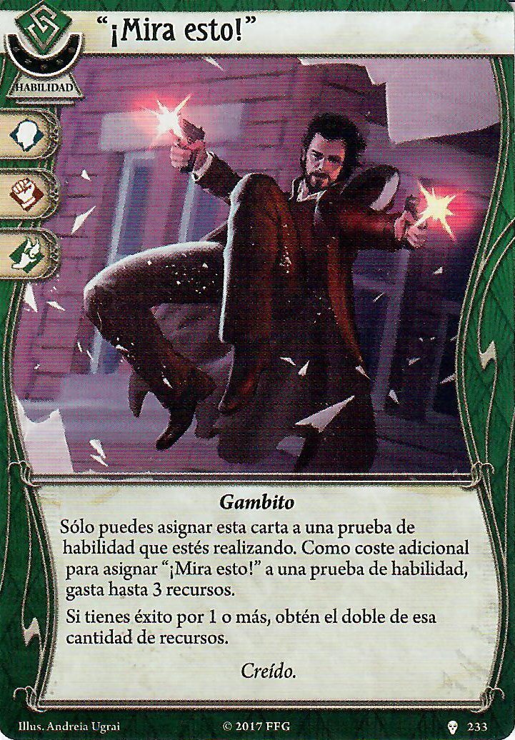 ¡Tan solo mira los iconazos que tiene ese evento! Asignándolo a una prueba de habilidad puede dar un +3 a intelecto o a agilidad, y en casos desesperados puede funcionar como un Coraje Inesperado en pruebas de combate o voluntad. Y necesito que te fijes bien en estos iconos porque éste va a ser el uso más común que le vais a dar a este evento. No porque sea malo, de hecho, me parece que tiene un efecto potentísimo para un evento rápido que solo cuesta un recurso. El problema es que sacarle jugo a este chanchullo es extremadamente dependiente de la situación.