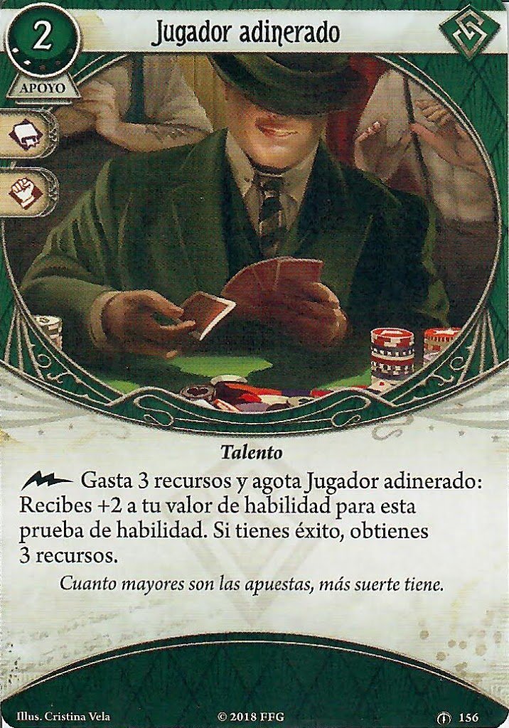 Otras opciones para mejorar su capacidad para superar pruebas de investigación serían Alice Luxley y Jugador Adinerado. Alice puede ser una aliada curiosa en combinación con Lola, permitiéndote realizar un punto de daño al usar la habilidad rápida de ésta. Por otra parte, si tu objetivo es un mazo que se aproveche de las cartas que se activan al “superar por X” las pruebas de habilidad, Jugador Adinerado va a ser casi indispensable.
