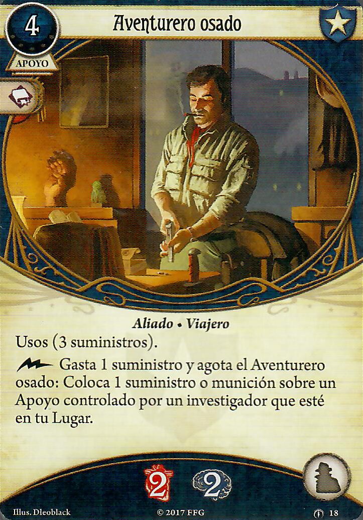 En lo que a evitar enemigos y usar el Arco Ornamentado respecta, Finn y Sefina tienen las de ganar, especialmente Finn con su acción extra para evitar. Sefina tiene acceso a hechizos, así que puede ocupar sus manos con el arco sin problemas, y Finn tiene un valor de investigación decente, por lo que puede usar simplemente cartas de habilidad para apoyar sus investigaciones. Pero Malasombra puede llevar la bandolera para ganar espacios de mano para armas y poder llevar tanto el arco como las ganzúas, por ejemplo. Si llevaras la de nivel 2, además, ganarías un punto de voluntad, que te protegería del mazo de encuentros. Además, a Malasombra puede acompañarle un Aventurero Osado, que una vez por turno puede recargar tu arco sin usar acciones, siempre y cuando le queden suministros, claro.