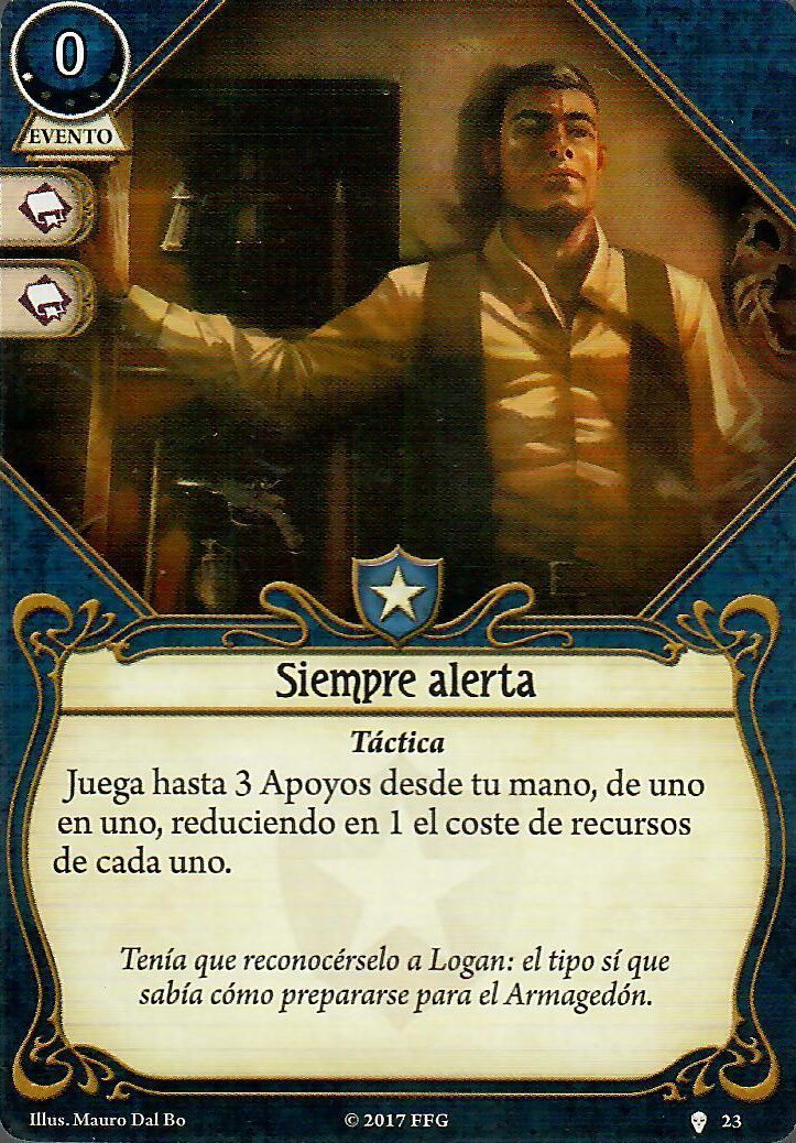 En niveles superiores podemos acceder a un par de cartas de Guardián que Malasombra puede ver con muy buenos ojos. Siempre Alerta y “Me las he visto en peores” consiguen cubrir puntos flojos de los mazos de este investigador a la hora que generan (o te ahorran) recursos. Sus mazos normalmente dependen mucho de conseguir tener en mesa muchas cartas de Apoyo, así que Siempre Alerta es perfecta para el primer turno, y más adelante son dos iconos de intelecto. “Me las he visto en peores” es muy buena para prevenir el horror que te va a llegar del mazo de encuentros por tu bajo nivel de voluntad, mientras genera recursos.