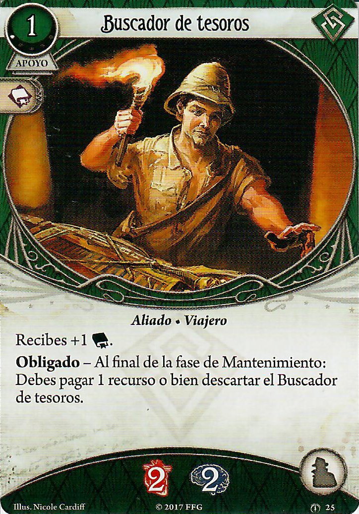 La primera es algo arriesgada teniendo en cuenta que el único valor de habilidad que tiene bueno de base es el de agilidad, así que inclúyela solo si crees que podrás hacer una prueba de habilidad fácilmente durante los escenarios. Poco puedo decir del Alijo de Emergencia, pero “¡Ocúpate tú de esto!” es muy interesante ya que te protege del mazo de encuentros a la vez que, por alguna razón que aun no comprendo, te consigue un recurso.