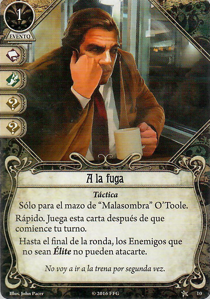 Dos cartas que me encanta combinar con este evento son Provocar y Escurridizo. En un turno en el que tu grupo se vea abrumado por la cantidad de enemigos que hay en un lugar, juega A la Fuga, luego Provocar para enfrentarte a todos los enemigos de ese lugar, aléjate de ese sitio como alma que lleva el diablo y, por último, dales esquinazo jugando Escurridizo para volver con tus compañeros. Si quieres asegurarte de no ver a esos enemigos en mucho tiempo, usa la habilidad de Malasombra para tener una acción extra con la que alejarte más aún.