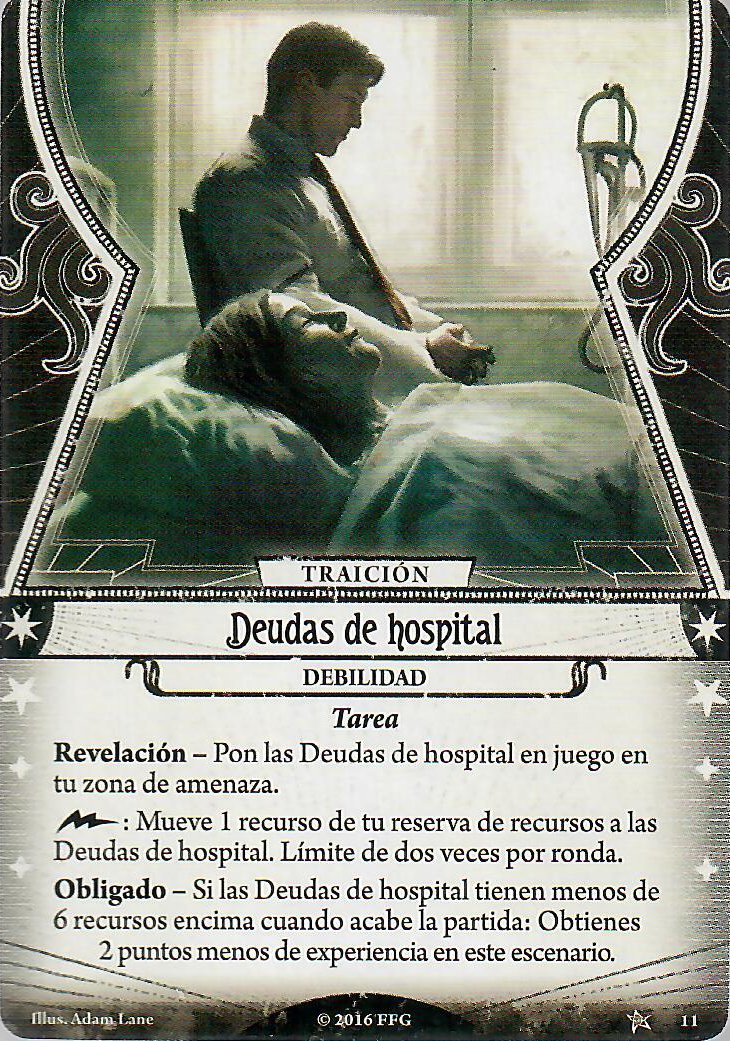 Hablando de la habilidad de Malasombra, como habrás podido leer en la carta de investigador, permite pagar dos recursos para comprar una acción adicional por ronda. Esta habilidad es muy potente si puedes activarla frecuentemente, pero en ocasiones simplemente te va a resultar imposible. La debilidad de Malasombra, como todas las buenas debilidades, contrarresta a la perfección su habilidad y es excelente a nivel temático. También es muy peligrosa en modo campaña si no consigues deshacerte de ella en un par de escenarios, pero inocua en escenarios independientes o finales de campaña. Las Deudas de Hospital te piden que al final del escenario haya al menos seis recursos sobre su carta, y cada turno puedes poner hasta dos recursos. No es una debilidad de la que sea excesivamente difícil deshacerse, pero el límite de dos recursos por turno la convierte en una patada en la boca si la robas en los últimos turnos de una partida.