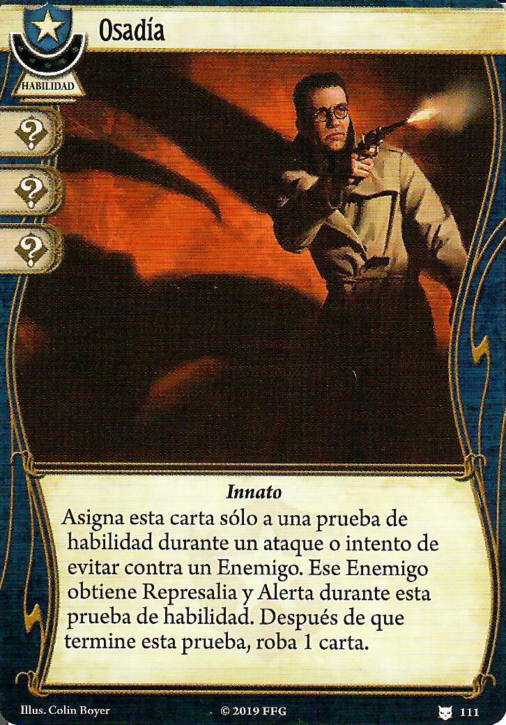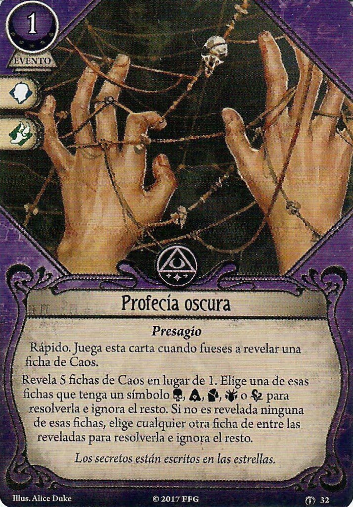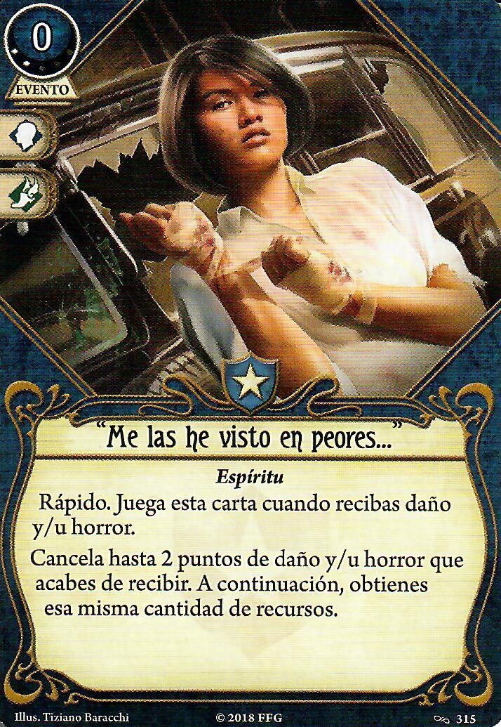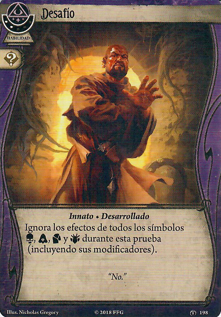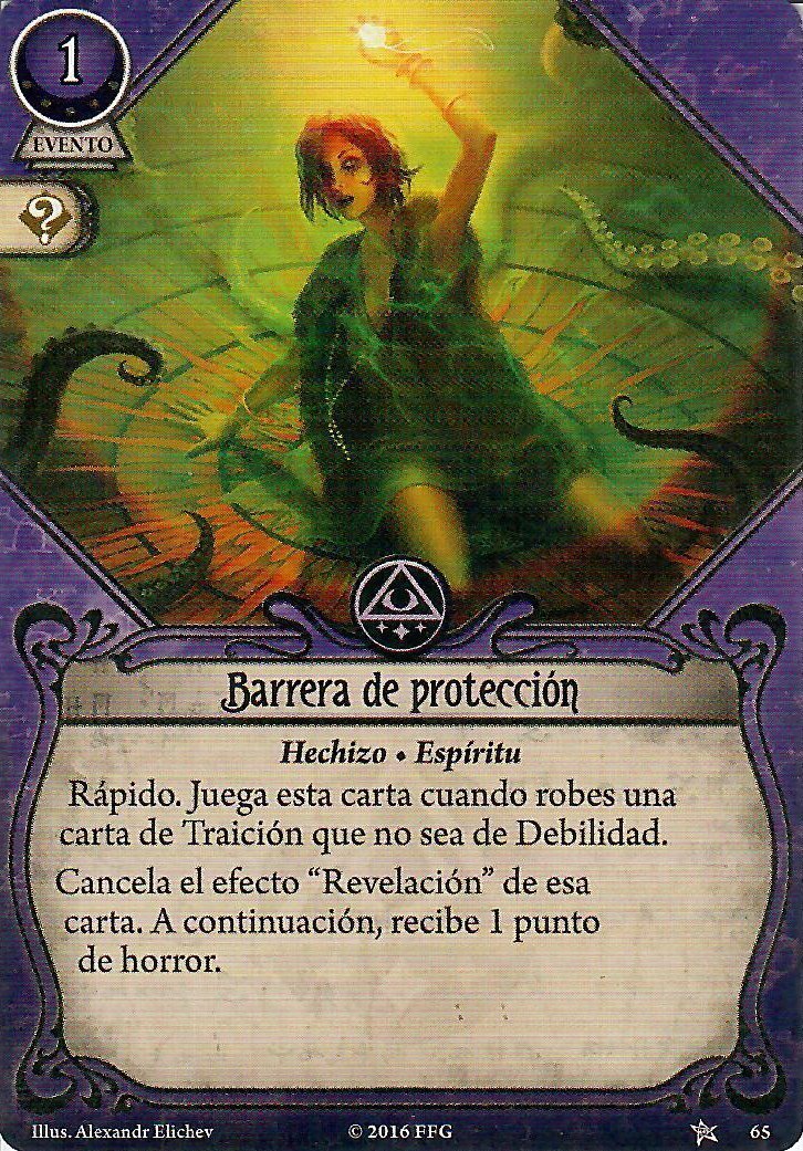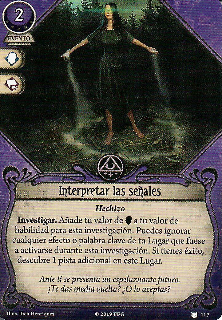 Desafío va a venir genial porque en muchas ocasiones puede asegurar el éxito. Además, este mazo va a poder realizar acciones de todo tipo, así que los iconos comodín van a venir genial. Para la Barrera de Protección he escogido la versión de nivel 0, pero estoy esperando a ver cuánta experiencia queda al final de la construcción del mazo por si me cabe alguna copia de nivel 2. Por último, Interpretar las Señales es un buen truco para investigar eficientemente. No sinergiza bien con Llenarse de Poder, pero creo que puede venir bien. Aún así, es mi primera opción si tengo que quitar alguna carta.