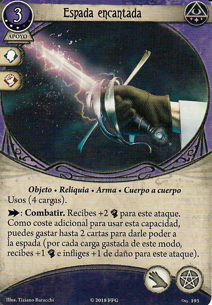 Diana Stanley no solo es apropiada por traer un arma de filo de serie. El acceso a la Espada Encantada mejorada y a cartas de Guardián también le ayudan mucho. Y caray… que llenar los dos espacios de mano con esas dos armas da un rollete espada y daga mágicas muy chulo. Como en el artículo anterior, vamos a seleccionar primero nuestras armas de filo. Las suficientes como para poder decir que es un mazo temático digno de una esgrimista.