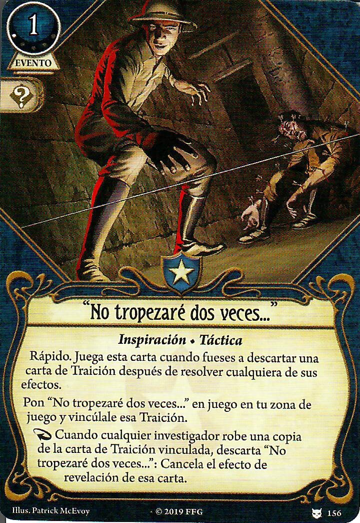 Negar la Existencia es una carta extremadamente versátil, creo que no hace falta explicar la razón por la que está en el mazo. «Me las he visto en peores» va a ser el principal método de generar recursos fuera de su habilidad. «No tropezaré dos veces» es un counter maravilloso, especialmente en El Círculo Roto. No solo puede contrarrestar la carta que robe cualquier jugador, sino que además deja una de esas cartas fuera del mazo de encuentros, en tu zona de juego. En caso de barajar el mazo de encuentros, ésta carta seguiría en tu zona de juego, por lo que tendrías menos posibilidades de robarla.
