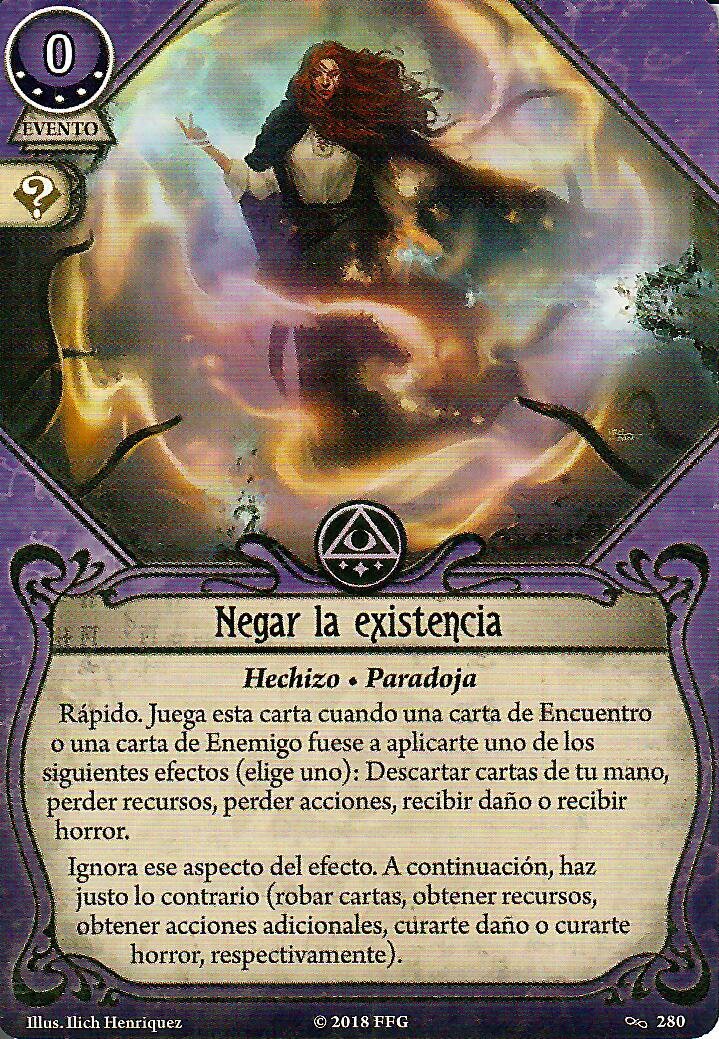 Aunque no vayamos a necesitar muchas cabezas, es importante incluir cartas de cancelación en cualquier mazo de Diana porque son su mejor motor de robo de cartas y recursos. Francamente, en esta sección todo viene bien. Osea, te pones a mirar qué cartas meter y es que es un festival. De hecho, mirando esa sección me ha venido a la cabeza otra variante de este mazo, pero esa la guardo para otro día. De todas las cartas que «cancelan» o «ignoran», he elegido Negar la Existencia (5), «Me las he visto en peores» (2), «No tropezaré dos veces…» (1), Desafío (2), Barrera de Protección e Interpretar las Señales.