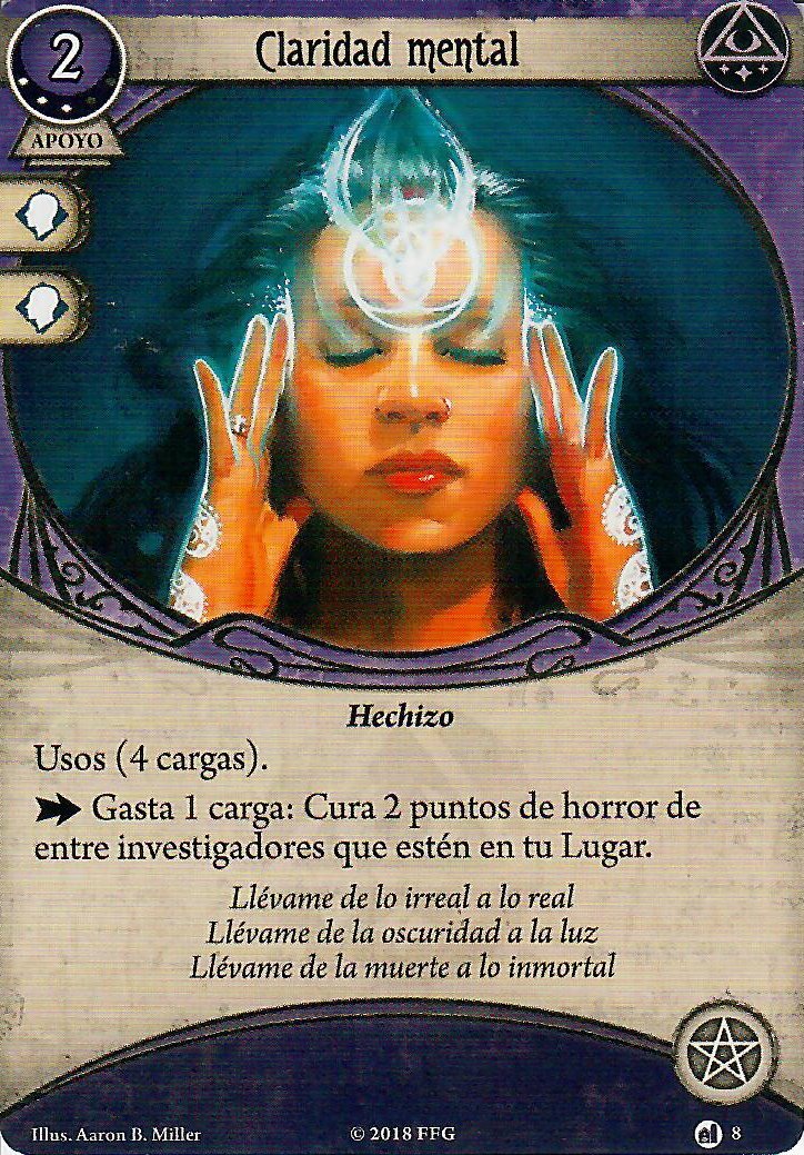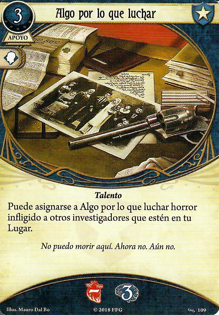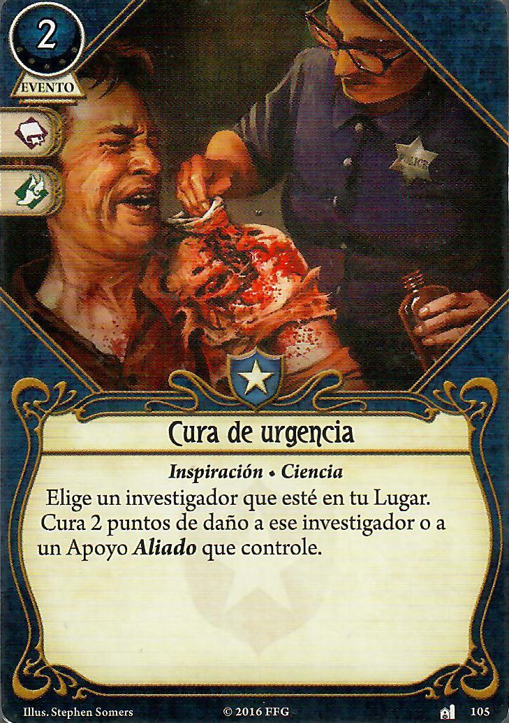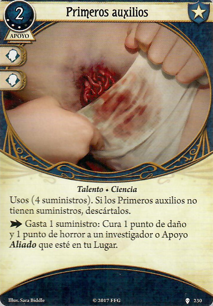 Puntos positivos: no ocupa slot, puedes utilizar su reacción para curar un horror adicional sin gastar nada, si usas la acción además de curar horror y dar un recurso (por la habilidad de Carolyn) le das una carta a quien estés curando.