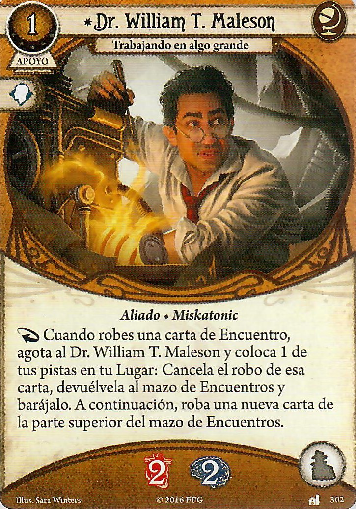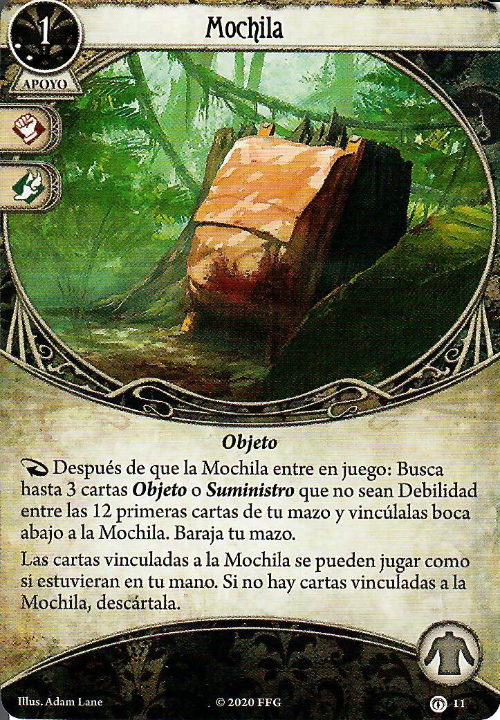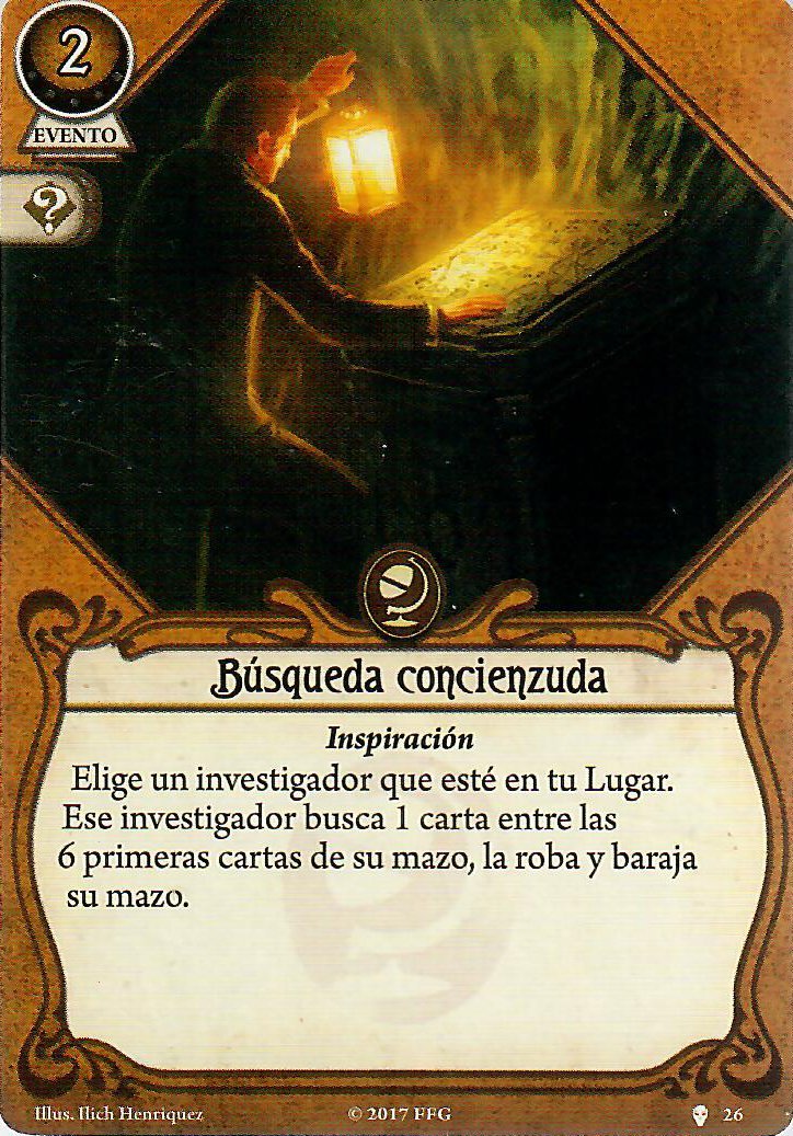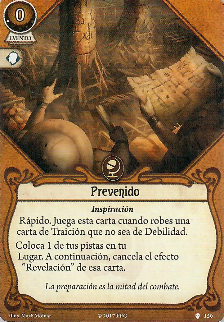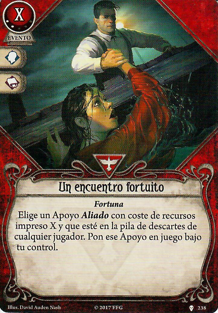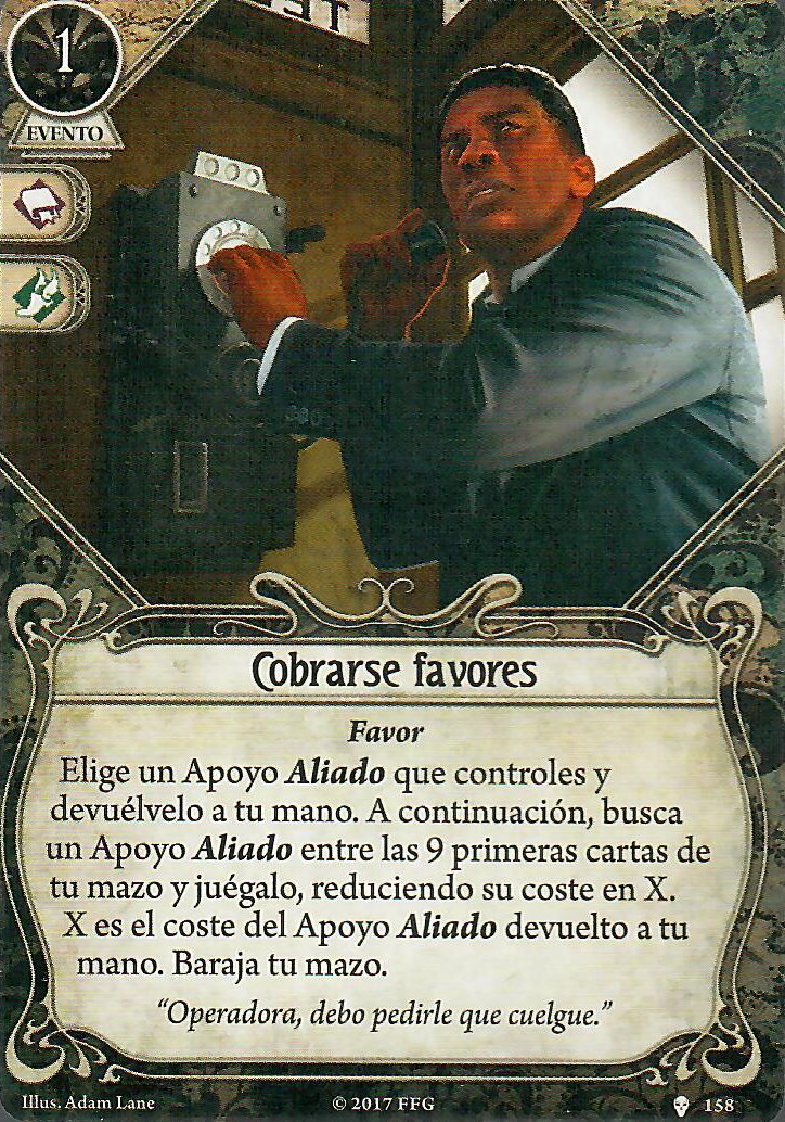 Como he mencionado Carisma es obligado con este señor, eso ya independientemente de sus cartas personales. También puede venirte bien llevar algún «cobrarse favores» para resetear el daño/horror que pueda haber sobre algún apoyo que tengas o incluso reemplazar alguno tocho que tengas en mesa por otro más prescindible (cambiar un «hermano Xavier» por un «aventurero osado» o algo así). Además sólo con acceso a guardián y rebelde no tienes cartas para recuperar aliados de la pila de descarte así que tu única opción para mantenerlos más tiempo es o curarlos o devolvértelos a la mano.