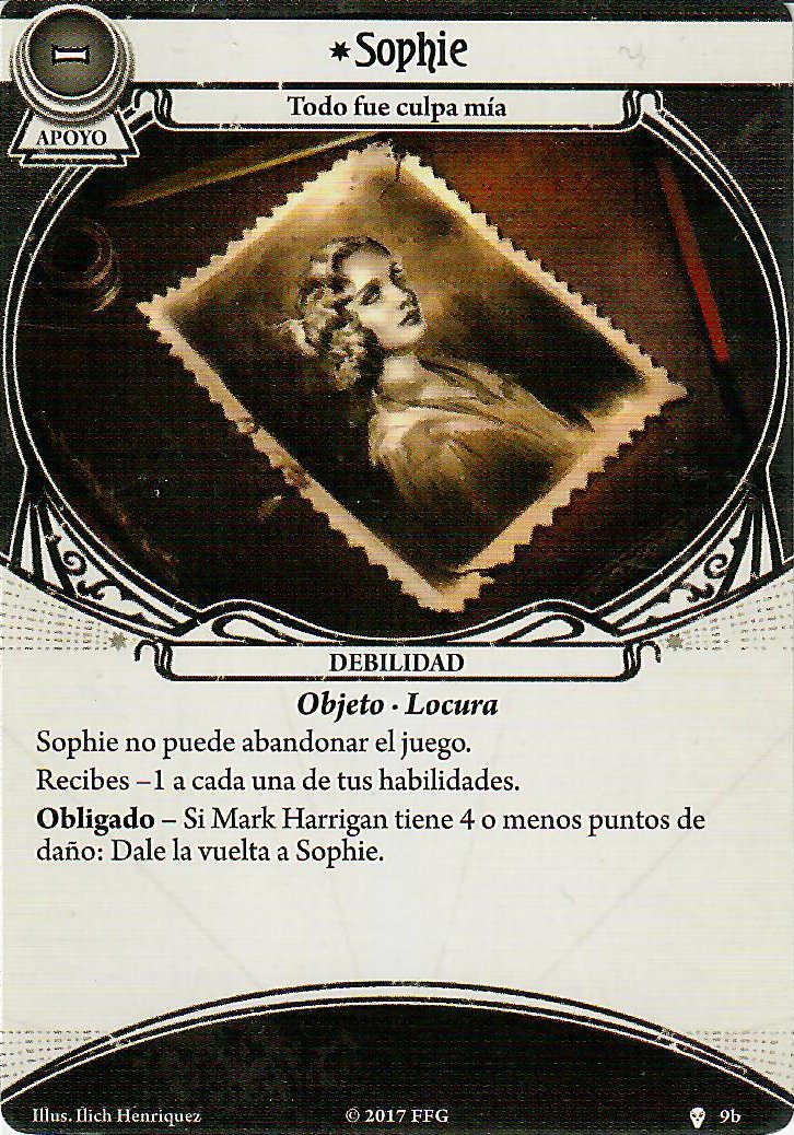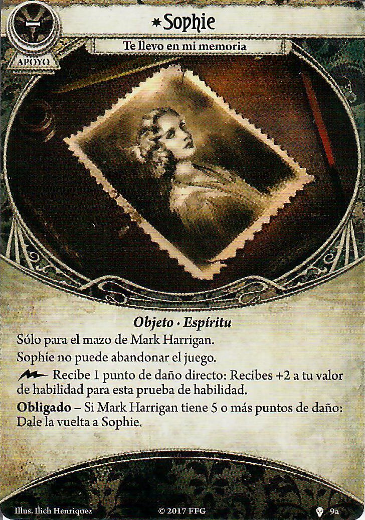 Ok tenemos al primer personaje en esta serie que tiene más de 2 carta signature. Empezamos por su carta permanente de doble cara «Sophie»; por un lado (eeeehhhh juego de palabras) tenemos que te da +2 a cualquier prueba de habilidad por comerte un punto de daño directo, que te viene muy bien con tu habilidad personal que te hace robar una carta cada vez que pones un daño en una carta que controles (límite de una vez por fase); como es acción de activación libre puedes hacerlo en la fase que quieras y explotar tu habilidad personal al máximo.