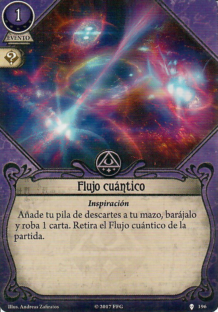 Funciona muy bien con tu amuleto «Por tu cuenta», que te reduce el coste de tus eventos incluso si los juegas desde la pila de descartes. Respecto a la debilidad lo único que se me ocurre es de alguna manera incluir «flujo cuántico» en tu mazo (con «versátil» por ejemplo) y jugarla cuando veas que tu pila de descartes comienza a estar peligrosamente poblada.