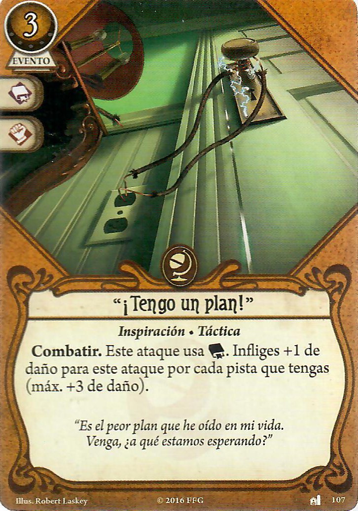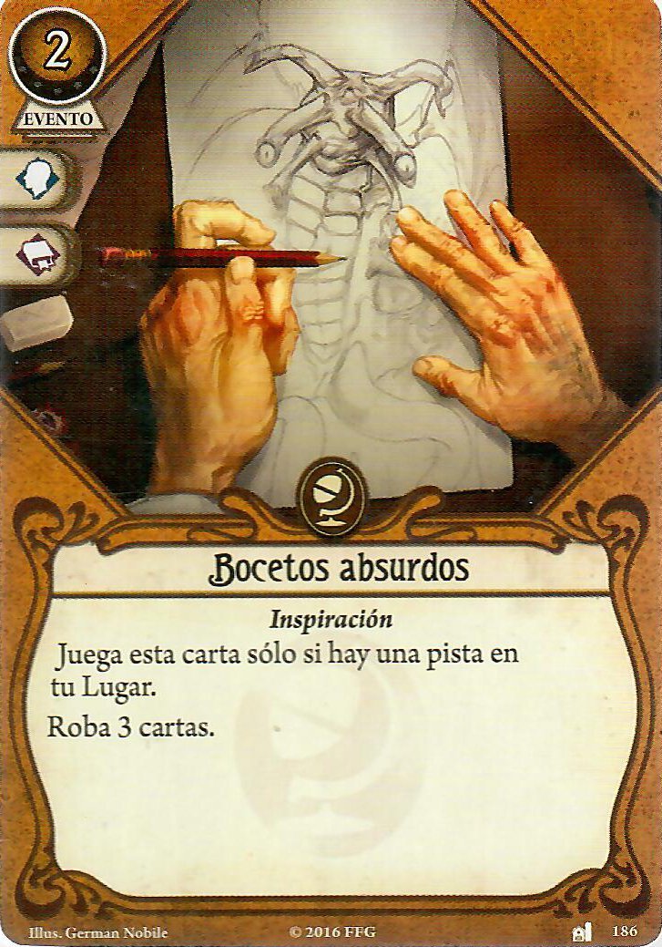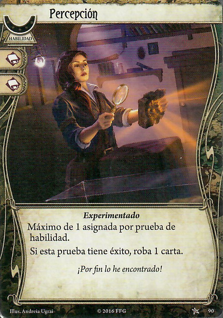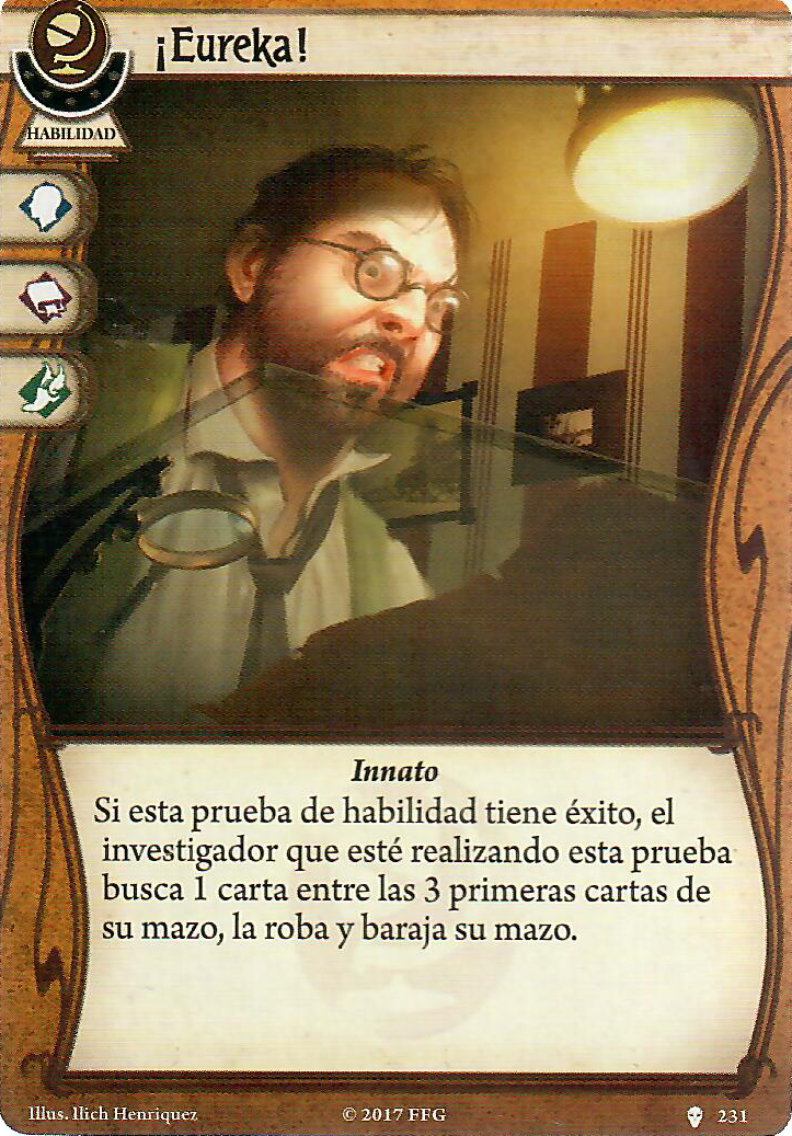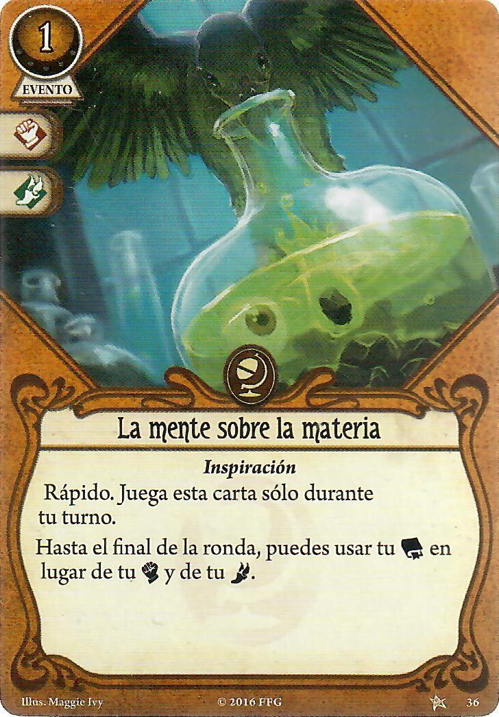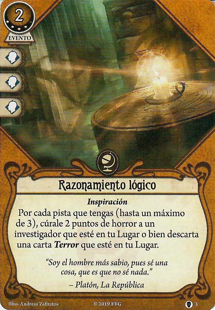 Con Tengo un plan y La mente sobre la materia podremos combatir y reventar ratas, sectarios, primigenios o lo que se nos interponga, aunque esta segunda también la podremos usar para evitar. Con búsqueda concienzuda y Bocetos absurdos podremos robar más cartas para ayudar a nuestra «Educación superior» y como vamos a llevar siempre pistas, con razonamiento lógico, su versión mejorada es de lo mejorcito, porque podremos curar hasta 6 puntos de horror de cualquier investigador en tu lugar o descartar cartas de terror, a veces también hay que ayudar.