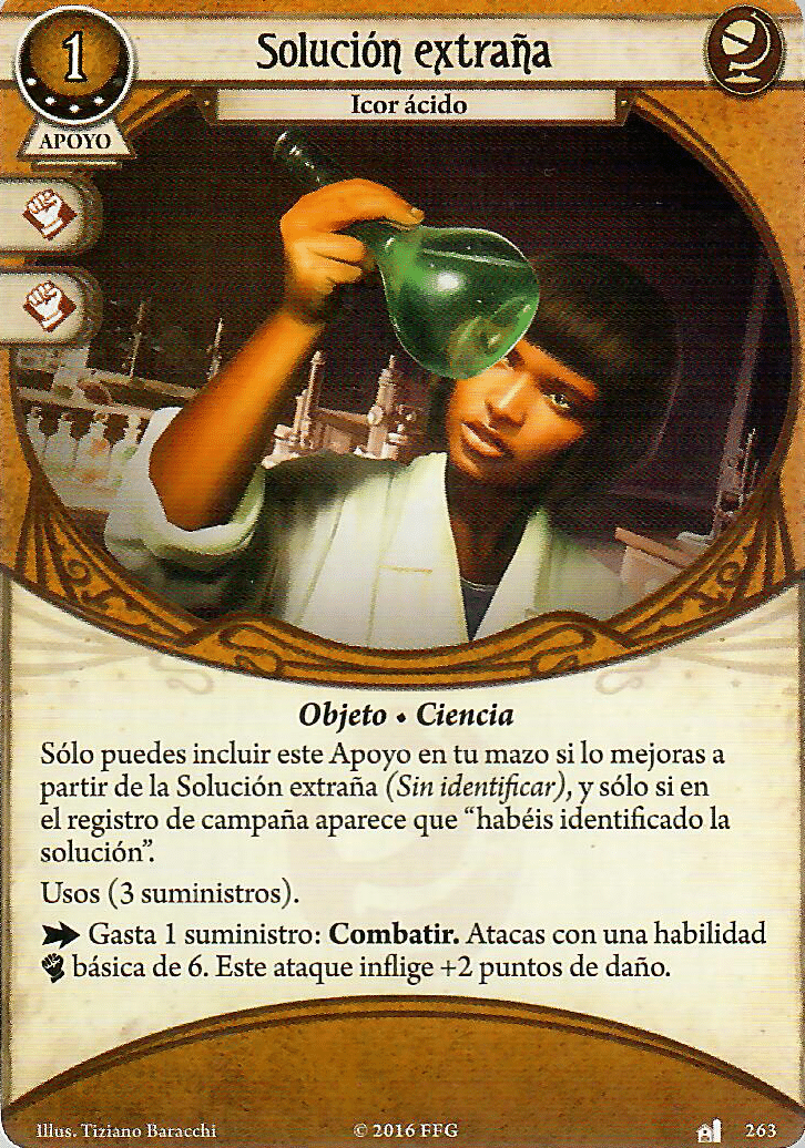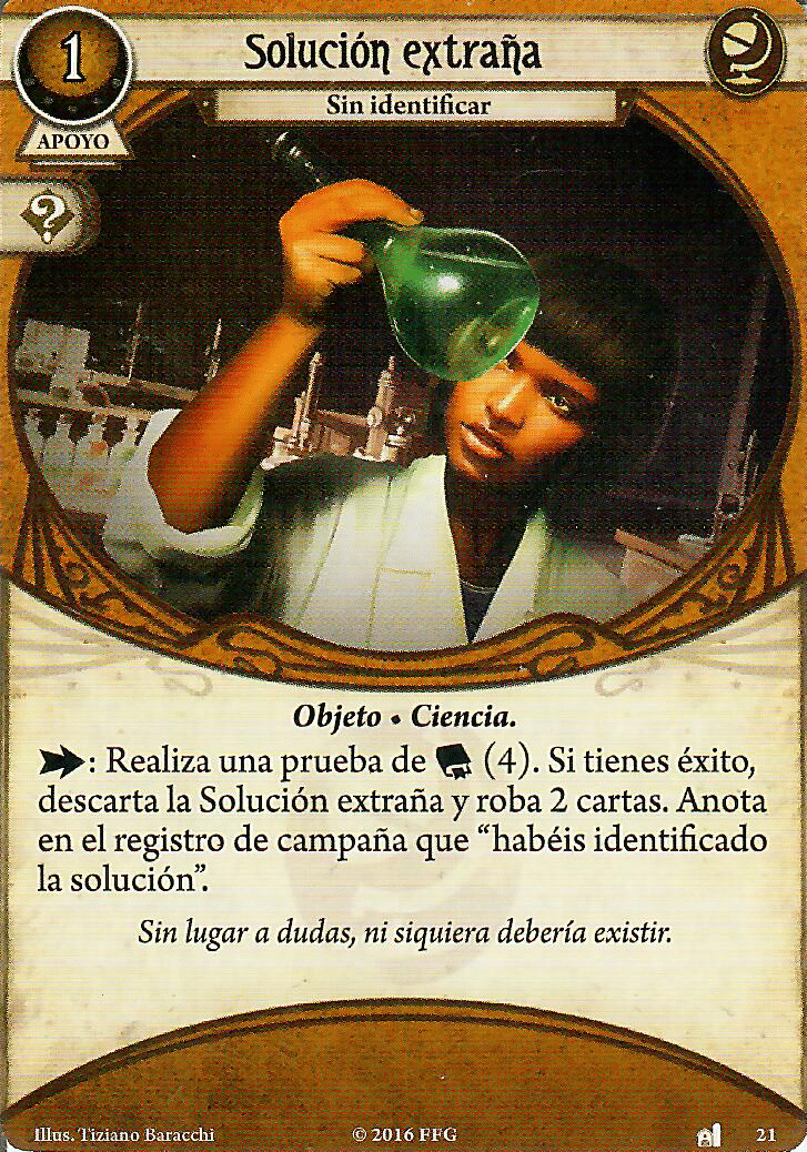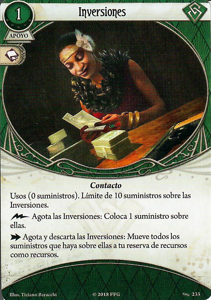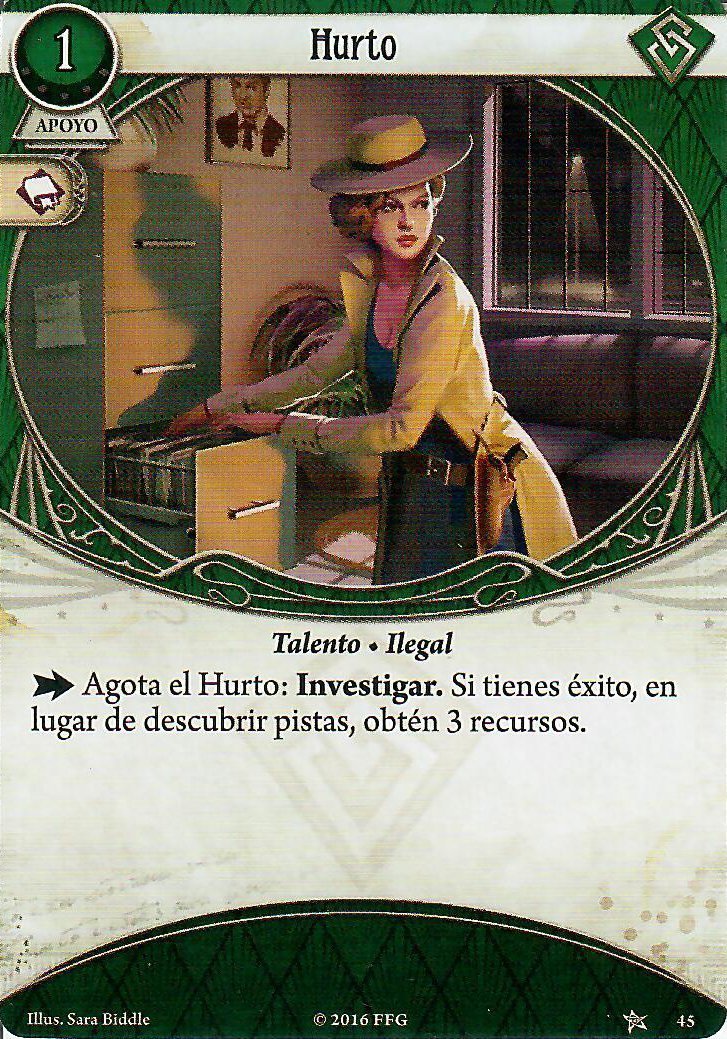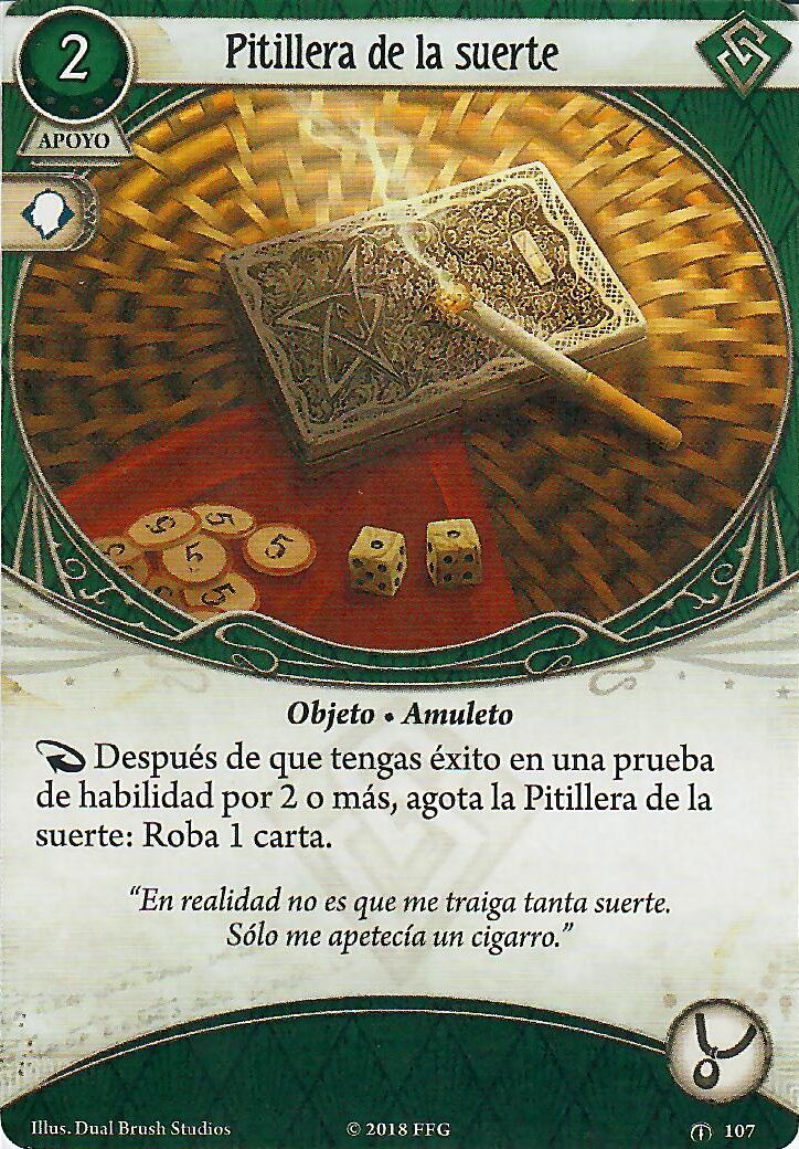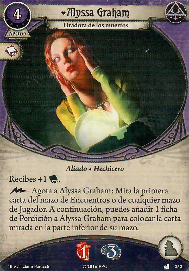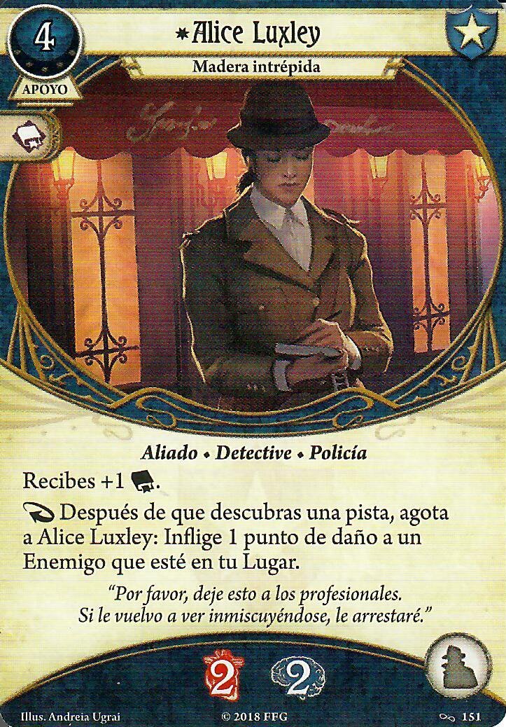Tenemos tres aliados que nos dan el icono de forma pasiva (Si, hay más aliados bastante buenos, como el Sr. Torre, pero para que la habilidad de Rex se dispare mejor nos harán falta estos) De estos 3 voy a pasar de Alyssa Graham, la tengo mucho cariño, pero su habilidad no le va a venir bien a Rex, pero los otros dos… son la crema de las natillas. El buen Doctor Milan Cristopher es, y será el mejor aliado de nuestros buscadores y si jugadores, esta es una de las 3 cartas de las que hablé que metieron en la lista de tabues, y es que aparte de llevarnos el +1, cada vez que investiguemos con éxito, obtenemos un recurso, por lo que decidieron que esta habilidad fuese «Agotando» al buen doctor, esto deberían haberlo pensado antes, porque nunca jugaré con esa mamarrachada, mientras no lo ponga en mi carta, el siempre apoyará mis investigaciones (Sois libre de hacer lo que queráis con esto ;D). Y que decir de Alice, después de descubrir una pista (sea de la forma que sea, ojo a esto, ya que podemos descubrir pistas con cartas rápidas de instapistas inclusive), la agotamos y ella saca su colt y le hace uno de daño a un enemigo que esté en tu lugar, independientemente de con quién esté enfrentado ese enemigo. Así cartas como «Carisma» cobran sentido para tener a Milan y Alice ayudándote en tu reportaje. No parece que vaya mal la cosa, si tenemos en juego las dos lupas, la llave de san huberto y a Milan y Alice en juego estamos contando que Rex investigaría de base con 9, y esto sin contar la carta de tarot, nada mal para nuestro reportero.