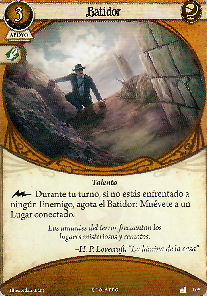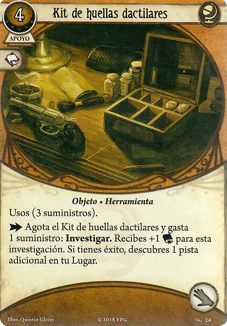Se que dije que los apoyos ya habían ocupado las manos, pero oye, igual alguien prefiere otra opción para las manos de Rex, para eso tenemos el kit de huellas dactilares, y es que aunque sólo tenga tres suministros, podemos gastarlos para darnos un +1 a la prueba y llevarnos dos pistas, si además de esto lo juntamos con la habilidad de Rex nos llevaríamos tres pistas por acción, al menos mientras nos den los suministros. En el caso de que queramos movernos tan rápido como Goku en Ultra instinto tenemos la carta de Batidor que nos permitirá movernos a nuestro antojo con acción rápida agotándola, que se encargue otro de enfrentarse al enemigo, encima, si llegamos a tener dos de estas cartas en juego (que podemos) podríamos movernos gratis hasta dos veces en turno, y además podemos combarla con trabajo de campo (que también podemos tener dos en juego) y darnos ese +2 a la primera prueba que vayamos a hacer dónde nos movamos, sea cual sea esta y siempre que el lugar tenga pistas, este +2 nos vendrá muy bien para activar la habilidad de Rex.