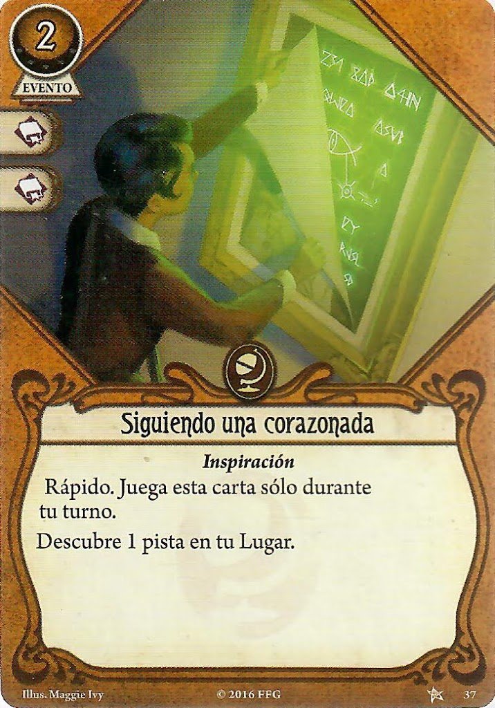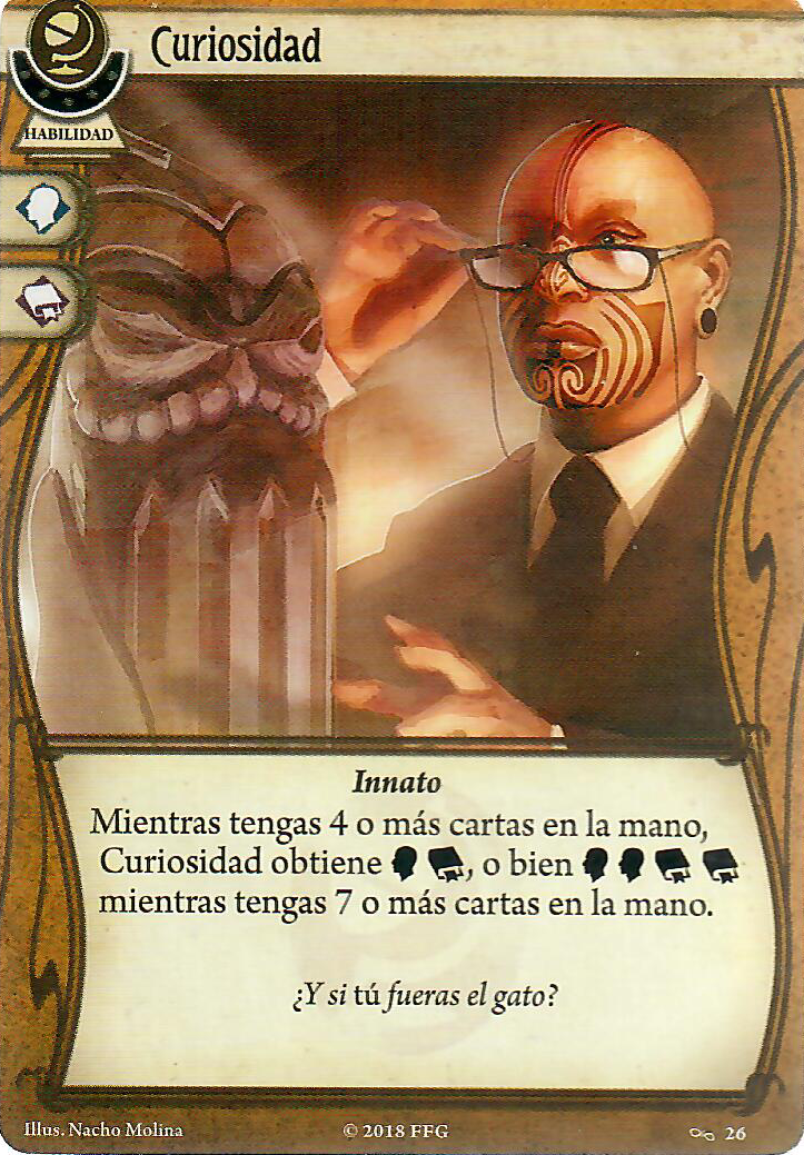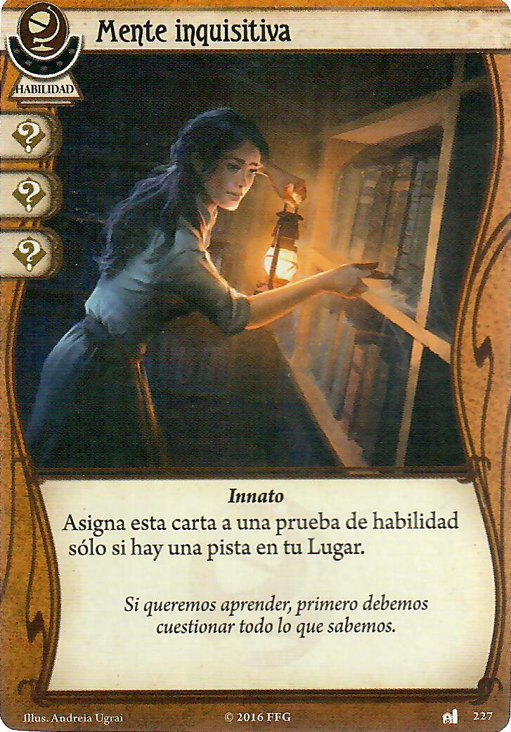 Como siempre vamos a tener la mano llena de cartas, Curiosidad nos va a estar dando 2 iconos de Voluntad e Intelecto, 3 en el mejor de los casos, como Mente inquisitiva, que siempre nos dará 3 iconos para la prueba que sea cuando haya una pista en tu lugar.
