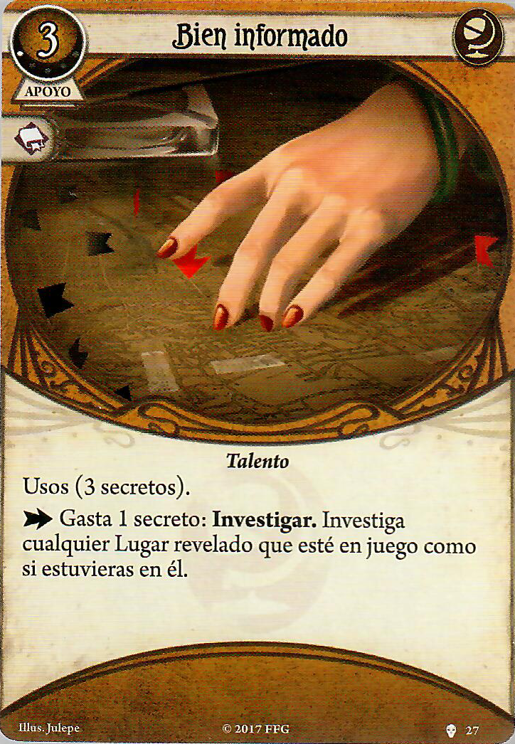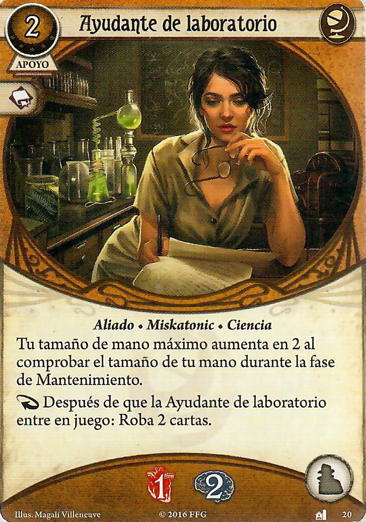 Y es que tenemos muchos más apoyos que nos pueden venir muy bien, os voy a poner unos que sin mucho en detalle os diré que con Bien conectado podremos dejar pistas por el camino mientras nos movemos y luego recogerlas desde la distancia. Con la ayudante de Laboratorio como aliada podemos tener 2 cartas más como tamaño máximo, esto puede venirnos muy bien si nuestro mazo se basa en robar muchas cartas, además cuando ella entra en juego nos hace robar dos.