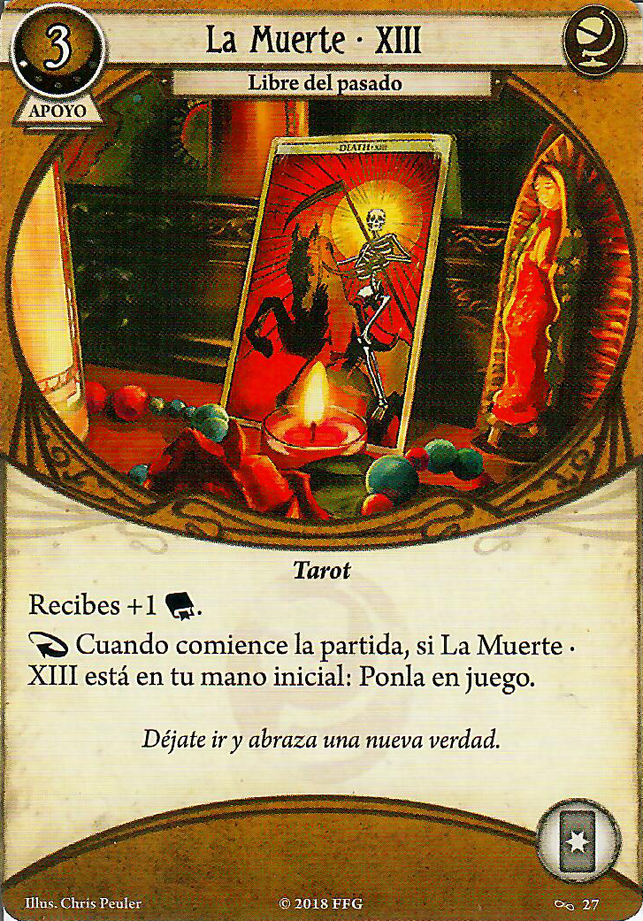 Con el círculo roto entraron las cartas Tarot, y la Muerte es una muy buena opción para tener esa carta que nos da +1 pasivo y que si está en nuestra mano inicial la ponemos en juego sin coste alguno, aun así las cartas de Tarot tienen siempre la pega de que como salgan con la partida avanzada, te va a costar, una acción, 3 recursazos, y si no la quieres jugar, nunca la podrás asignar a pruebas de habilidad, ya que no tiene iconos, es su mayor pega.