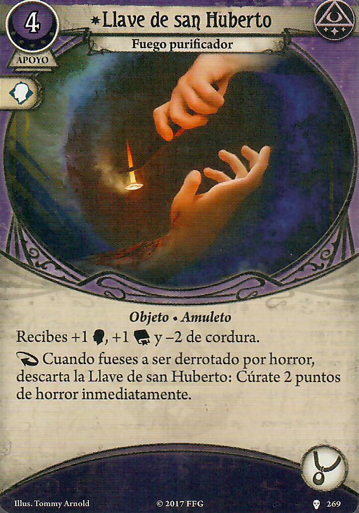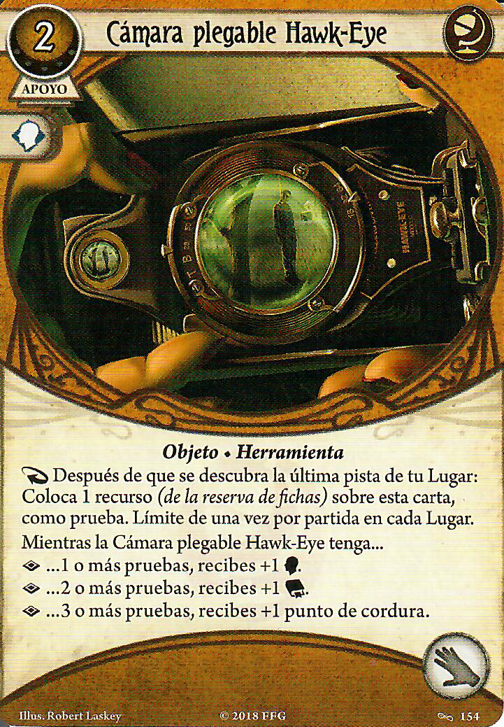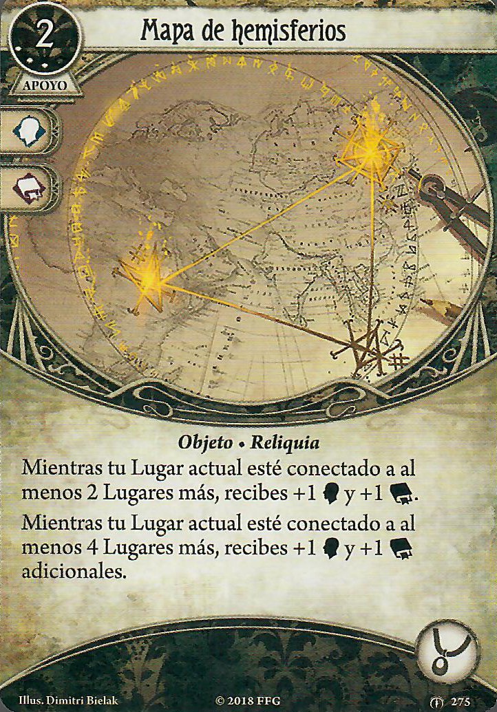 Y es que otra cosa no, pero apoyos que nos den ese icono de manera pasiva tenemos muchos, y como tenemos que tener las manos ocupadas, la lupa es un clásico, he puesto la que está con experiencia porque es de obligada evolución, mientras que la normal nos cuesta 1 recurso, esta cuesta 0, sigue siendo rápida y si el lugar no tiene pistas podemos devolverla a la mano, esto comba a la perfección con algo que veremos luego, mientras que la cámara plegable (odiada por algunos, amada por otros) nos puede ayudar bastante como segunda opción, tarda algo más en funcionar, pero una vez tengamos las dos listas y a tope, tendremos +2 de Voluntad +2 de Intelecto y +2 puntos de cordura, no está nada mal, así potenciamos lo mejorcito de Rex, y es que ese + 2 de cordura nos puede venir muy bien para el mejor Accesorio que este señor puede llevar, la llave de San Huberto, nos quita +2 de cordura y nos da +1 a esos dos atributos que acabamos de decir, lo mejor es que cuando muramos por horror, la descartamos y nos curamos 2 de horror, todo ventajas, una opción cara en experiencia algo interesante y que no ha visto mucha mesa es el Mapa de hemisferios, casi siempre se va a cumplir el primer punto, ya que rara es la vez que no estás en un sitio con dos conexiones, el segundo punto es más difícil de cumplir, aun así es una carta muy situacional, por lo que no es de mis favoritas.