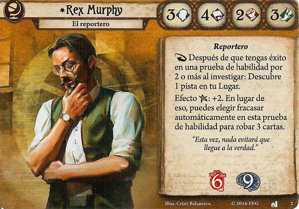 Su carta personal es muy buena, te puede llegar a dar 3 iconos de intelecto (El que utilice el icono de ? cómo otro que no sea este le corto las manos), o bien para robar 5 cartas, y es que seamos realistas, si juegas su carta cuando sólo tienes dos pistas para robar 2 cartas no renta mucho, por eso esperad a tener cinco pistas (no debería de ser ningún problema, ya que en el segundo turno deberías tenerlas), esta carta sólo va a flojear en juego en solitario, quizás a 2 jugadores, porque no va a haber tantas pistas en los lugares como las hubiese con más jugadores, pero aun así, es muy buena. Pero no todo podía ser un camino de rosas y abedules, porque su debilidad es una patada en la boca, encima de hacerte repetir revelar una ficha de caos, tendrás que fallar por este efecto para… devolverla a tu mazo… ¿En serio? ¿Debilidades que vuelven al mazo? Maldito Yogurlado. La Debilidad de Rex Murphy puede ser un gran inconveniente, pero esto es solo una piedra en el camino para convertirse en el mejor de los reporteros, después de todo, el Arkham Advertiser no se escribe sólo.