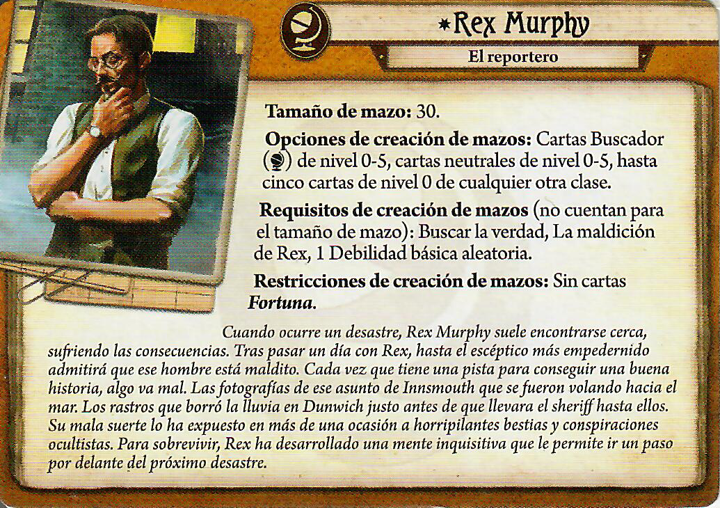 La creación de mazo es la de todos los investigadores de Dunwich, podemos añadir hasta 5 cartas de nivel 0 de cualquier otra clase, lo que está bastante bien, ya hablaremos más adelante de cuales podría ser, aun así nos restringen el uso de las cartas Fortuna (aunque tampoco le van a hacer mucha falta), y es que como todos sabemos, Rex Murphy está maldito, como el Yogurlado.