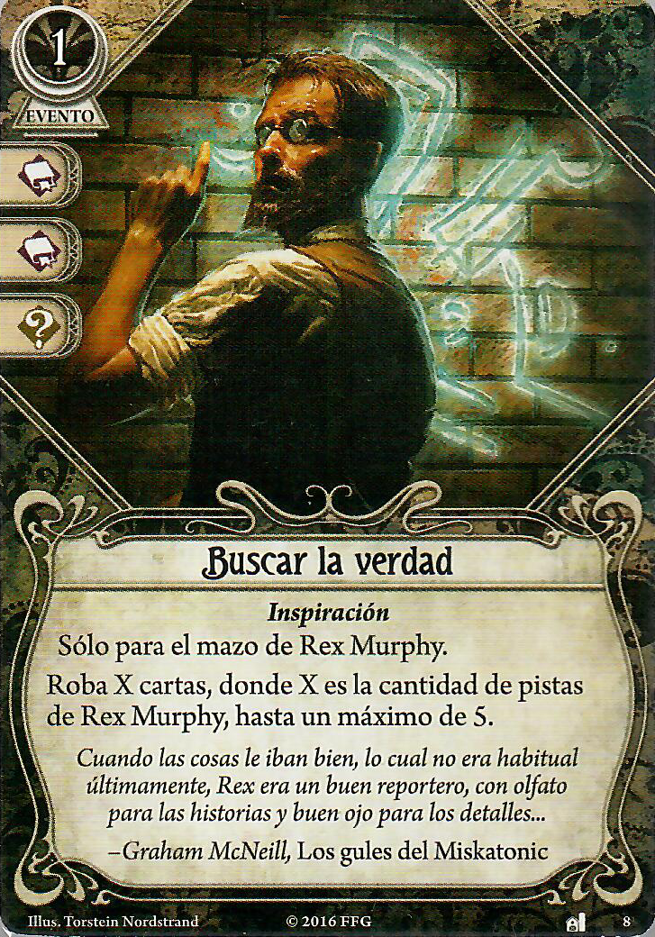 Y es que viendo sus Stats no son nada malos, seamos realistas, el 2 en combate no lo vamos a utilizar mucho, aunque si quisiéramos podríamos (ya hablaremos de eso), pero con los otros stats tenemos un investigador con el que podremos evitar y pasar pruebas del mazo de encuentros sin tener que comernos la cabeza demasiado, y como es un buscador, luego podemos investigar sin problemas, sabemos que el valor de Intelecto es de los valores que más se pueden potenciar gracias a apoyos que nos van a hacer que suba como la espuma, y es que el 4 que tiene de intelecto está más que justificado, porque si tuviese 5 en este valor, pasaríamos del mejor buscador del juego, a uno que lo rompe completamente. Además, mirad que roto estará con los stats como los tiene, que es el único investigador que está en la lista de cartas «Mutadas» a día de hoy y es que su habilidad de reacción de descubrir una pista adicional CADA VEZ que investigas por 2 o más está rota (En la lista de Mutadas esta habilidad obtiene «Límite de una vez por ronda»), por eso con la llegada de la lista de Tabúes hay 3 cartas, incluyendo a Rex Murphy, que comban a la maravilla, y es la razón de que las tres hayan sido nerfeadas. Su habilidad de símbolo arcano nos da un +2, que no está nada mal para activar su habilidad personal, la segunda parte es algo más situacional, podemos pasar la prueba y ya está, o decidir fracasar (Para esto la habéis tenido que pasar antes con éxito, que ya os veo pensar en maldades) para robar tres cartas, es muy situacional, porque siempre que hacemos una prueba de habilidad, necesitamos pasarla porque vamos muy achuchados, pero tampoco es una mala habilidad, nos puede combar muy bien con otras cartas.